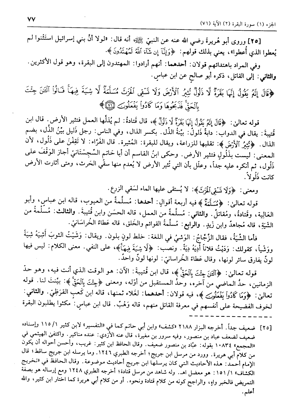 قالَ إِنَّهُ يَقُولُ إِنَّها بَقَرَةٌ لا ذَلُولٌ تُثِيرُ الْأَرْضَ وَلا تَسْقِي الْحَرْثَ مُسَلَّمَةٌ لا شِيَةَ فِيها قالُوا الْآنَ جِئْتَ بِالْحَقِّ فَذَبَحُوها وَما كادُوا يَفْعَلُونَ (71)