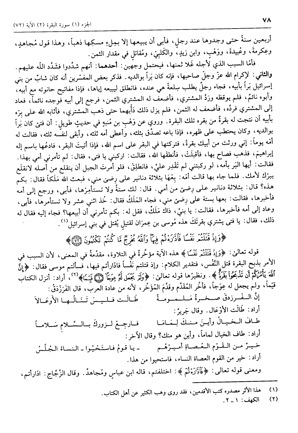 قوله تعالى: وَإِذْ قَتَلْتُمْ نَفْساً هذه الآية مؤخرة في التلاوة، مقدمة في المعنى، لأن السبب في الأمر بذبح البقرة قتل النفس، فتقدير الكلام: وإِذ قتلتم نفساً فادّارأتم فيها، فسألتم موسى فقال: إِنَّ اللَّهَ يَأْمُرُكُمْ أَنْ تَذْبَحُوا بَقَرَةً. ونظيرها قوله تعالى: وَلَمْ يَجْعَلْ لَهُ عِوَجاً (1) قَيِّماً «2» ، أراد: أنزل الكتاب قيماً، ولم يجعل له عوجاً، فأخر المقدم وقدم المؤخر، لأنه من عادة العرب، قال الفرزدق: