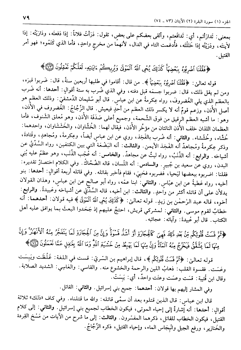 فقلنا: اضربوه ببعضها ليحيا، فضربوه فحيي، فقام فأخبر بقاتله. وفي قاتله أربعة أقوال: أحدها: بنو أخيه، رواه عطية عن ابن عباس. والثاني: ابنا عمه، رواه أبو صالح عن ابن عباس، وهذان القولان يدلان على أن قاتله أكثر من واحد. والثالث: ابن أخيه، قاله السدي عن أشياخه وعبيدة. والرابع: