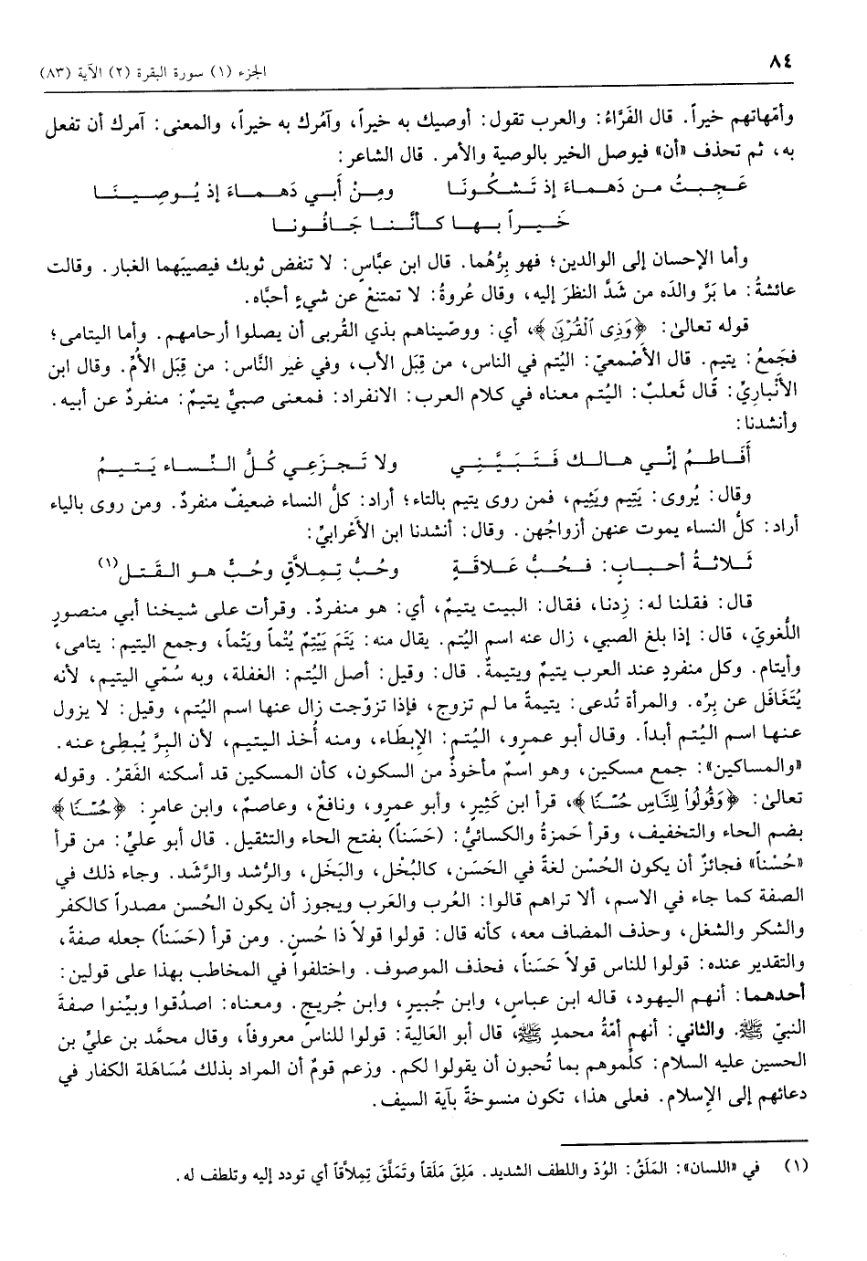 «والمساكين» : جمع مساكين، وهو اسم مأخوذ من السكون، كأن المساكين قد أسكنه الفقر. وقوله تعالى: وَقُولُوا لِلنَّاسِ حُسْناً، قرأ ابن كثير، وأبو عمرو، ونافع، وعاصم، وابن عامر: حُسْناً بضم الحاء والتخفيف، وقرأ حمزة والكسائي: (حَسَناً) بفتح الحاء والتثقيل. قال أبو علي: من قرأ «حُسْناً» فجائز أن يكون الحسن لغة في الحسن، كالبُخْل، والبَخَل، والرُشد والرشَد. وجاء ذلك في الصفة كما جاء في الاسم، ألا تراهم قالوا: العُرب والعرَب ويجوز أن يكون الحسن مصدراً كالكفر والشكر والشغل، وحذف المضاف معه، كأنه قال: قولوا قولاً ذا حسن. ومن قرأ (حَسَناً) جعله صفة، والتقدير عنده: قولوا للناس قولاً حسناً، فحذف الموصوف. واختلفوا في المخاطب بهذا على قولين: