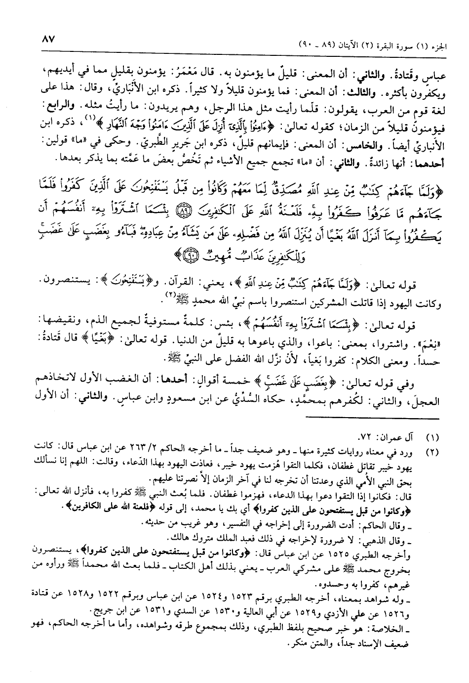 وأخرجه الطبري 1525 عن ابن عباس قال: وَكانُوا مِنْ قَبْلُ يَسْتَفْتِحُونَ عَلَى الَّذِينَ كَفَرُوا، يستنصرون بخروج محمد صلّى الله عليه وسلّم على مشركي العرب- يعني بذلك أهل الكتاب- فلما بعث الله محمدا صلّى الله عليه وسلّم ورأوه من غيرهم، كفروا به وحسدوه.