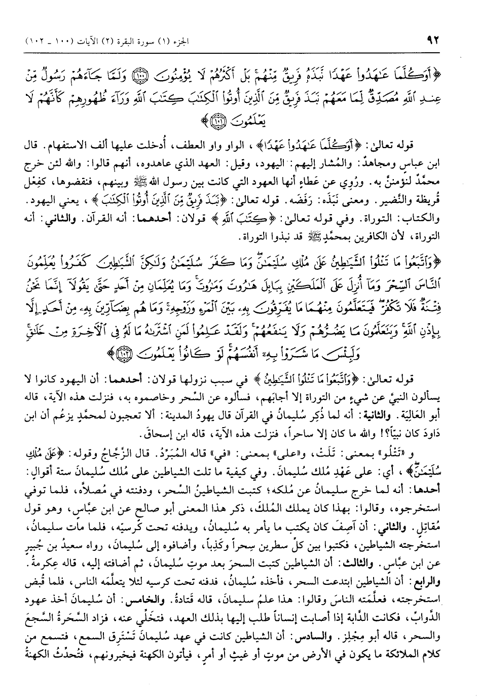 وَاتَّبَعُوا ما تَتْلُوا الشَّياطِينُ عَلى مُلْكِ سُلَيْمانَ وَما كَفَرَ سُلَيْمانُ وَلكِنَّ الشَّياطِينَ كَفَرُوا يُعَلِّمُونَ النَّاسَ السِّحْرَ وَما أُنْزِلَ عَلَى الْمَلَكَيْنِ بِبابِلَ هارُوتَ وَمارُوتَ وَما يُعَلِّمانِ مِنْ أَحَدٍ حَتَّى يَقُولا إِنَّما نَحْنُ فِتْنَةٌ فَلا تَكْفُرْ فَيَتَعَلَّمُونَ مِنْهُما ما يُفَرِّقُونَ بِهِ بَيْنَ الْمَرْءِ وَزَوْجِهِ وَما هُمْ بِضارِّينَ بِهِ مِنْ أَحَدٍ إِلاَّ بِإِذْنِ اللَّهِ وَيَتَعَلَّمُونَ ما يَضُرُّهُمْ وَلا يَنْفَعُهُمْ وَلَقَدْ عَلِمُوا لَمَنِ اشْتَراهُ ما لَهُ فِي الْآخِرَةِ مِنْ خَلاقٍ وَلَبِئْسَ ما شَرَوْا بِهِ أَنْفُسَهُمْ لَوْ كانُوا يَعْلَمُونَ (102)