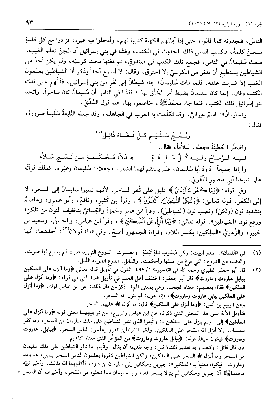 - وقال القرطبي رحمه الله في «تفسيره» 2/ 50- 51: قوله تعالى: وَما أُنْزِلَ عَلَى الْمَلَكَيْنِ «ما» نفي، والواو للعطف على قوله: وَما كَفَرَ سُلَيْمانُ وذلك أن اليهود قالوا: إن الله أنزل جبريل وميكائيل بالسحر، فنفى الله ذلك. وفي الكلام تقديم وتأخير، التقدير: وما كفر سليمان، وما أنزل على الملكين، ولكن الشياطين كفروا يعلّمون الناس السحر ببابل هاروت وماروت، فهاروت وماروت بدل من الشياطين في قوله وَلكِنَّ الشَّياطِينَ كَفَرُوا. هذا أولى ما حملت عليه الآية من التأويل، وأصح ما قيل فيها ولا يلتفت إلى سواه، فالسحر من استخراج الشياطين للطافة جوهرهم، ودقة أفهامهم، وأكثر ما يتعاطاه من الإنس النساء وخاصة في حال طمثهنّ، قال الله تعالى: وَمِنْ شَرِّ النَّفَّاثاتِ فِي الْعُقَدِ وقال الشاعر: