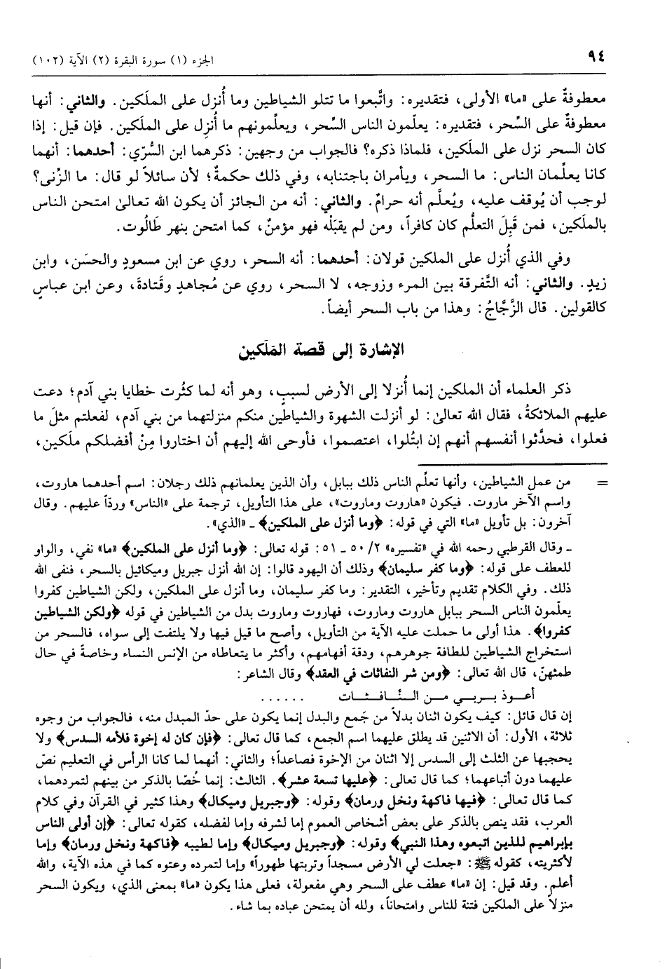 معطوفة على «ما» الأولى، فتقديره: واتبعوا ما تتلو الشياطين وما أُنزل على الملكين. والثاني: أنها معطوفة على السحر، فتقديره: يعلّمون الناس السحر، ويعلمونهم ما أنزل على الملكين. فإن قيل: إذا كان السحر نزل على الملكين، فلماذا ذكره؟ فالجواب من وجهين: ذكرهما ابن السري: أحدهما: أنهما كانا يعلمان الناس: ما السحر، ويأمران باجتنابه، وفي ذلك حكمة لأن سائلاً لو قال: ما الزنى؟
