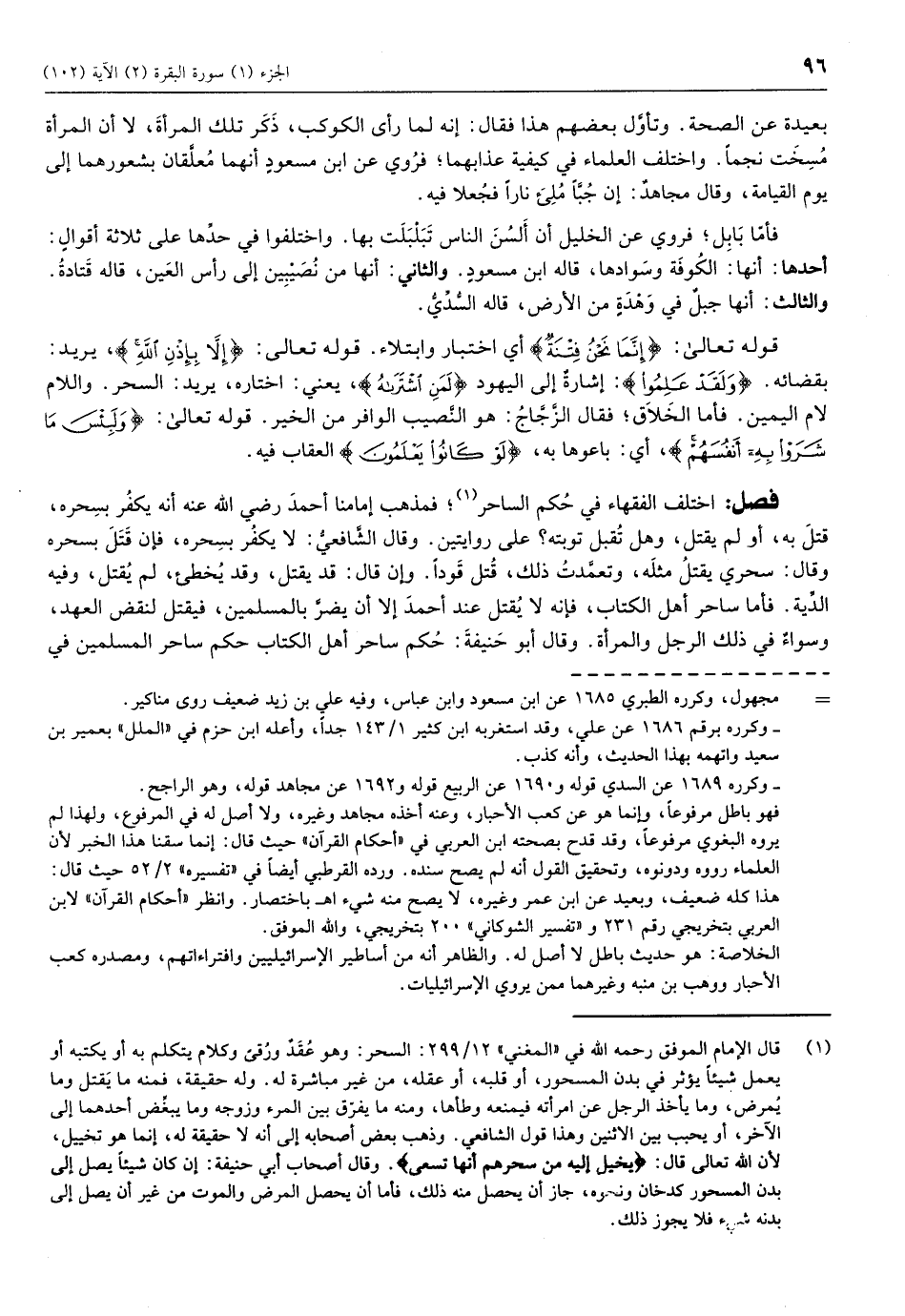 (1) قال الإمام الموفق رحمه الله في «المغني» 12/ 299: السحر: وهو عقد ورقى وكلام يتكلم به أو يكتبه أو يعمل شيئا يؤثر في بدن المسحور، أو قلبه، أو عقله، من غير مباشرة له. وله حقيقة، فمنه ما يقتل وما يمرض، وما يأخذ الرجل عن امرأته فيمنعه وطأها، ومنه ما يفرّق بين المرء وزوجه وما يبغّض أحدهما إلى الآخر، أو يحبب بين الاثنين وهذا قول الشافعي. وذهب بعض أصحابه إلى أنه لا حقيقة له، إنما هو تخييل، لأن الله تعالى قال: يُخَيَّلُ إِلَيْهِ مِنْ سِحْرِهِمْ أَنَّها تَسْعى. وقال أصحاب أبي حنيفة: إن كان شيئا يصل إلى بدن المسحور كدخان ونحوه، جاز أن يحصل منه ذلك، فأما أن يحصل المرض والموت من غير أن يصل إلى بدنه شيء فلا يجوز ذلك.