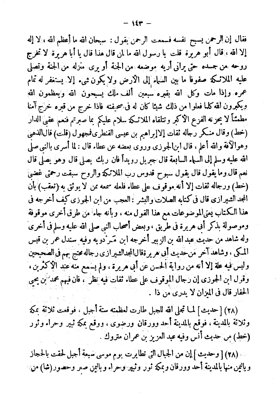 (28) [حَدِيثٌ] " لَمَّا تَجَلَّى اللَّهُ لِلْجَبَلِ طَارَتْ لِعَظَمَتِهِ سِتَّةُ أَجْبُلٍ، فَوَقَعَتْ ثَلاثَةٌ بِمَكَّةَ وَثَلاثَةٌ بِالْمَدِينَةِ، فَوَقَعَ بِالْمَدِينَةِ أُحُدٌ وَوَرْقَانُ وَرَضْوَى، وَوَقَعَ بِمَكَّة ثَبِيرٌ وَحِرَاءُ وَثَوْرٌ " (خطّ) مِنْ حَدِيثِ أَنَسٍ وَفِيهِ عَبْدُ الْعَزِيزِ بْنُ عِمْرَانَ مَتْرُوكٌ.