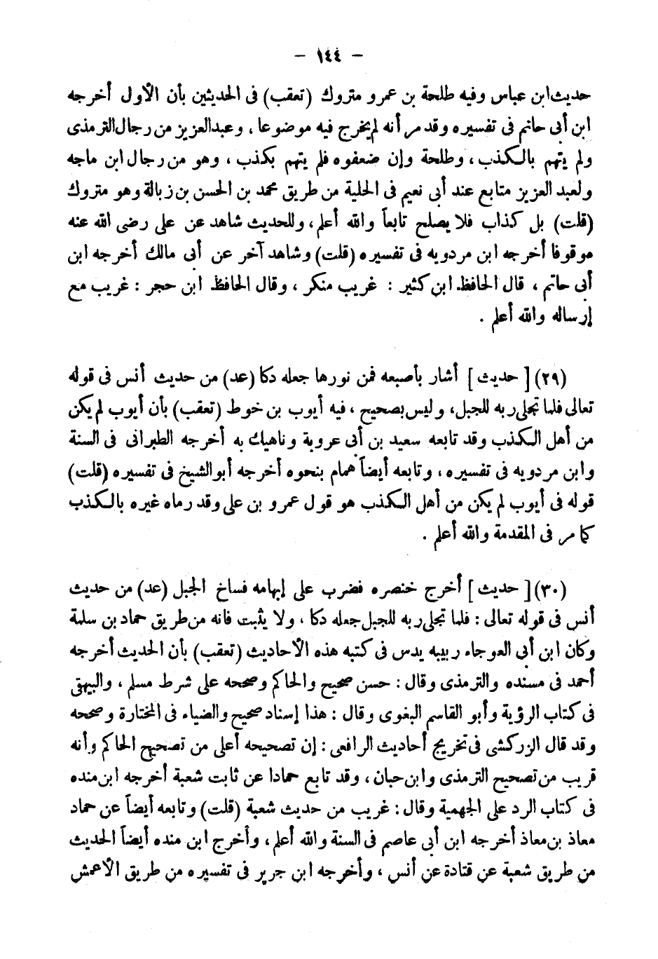 حَدِيثِ ابْنِ عَبَّاسٍ وَفِيهِ طَلْحَةُ بْنُ عَمْرٍو مَتْرُوكٌ (تُعُقِّبَ) فِي الْحَدِيثَيْنِ بِأَنَّ الأَوَّلَ أَخْرَجَهُ ابْنُ أَبِي حَاتِمٍ فِي تَفْسِيرِهِ وَقَدِ مَرَّ أَنَّهُ لَمْ يُخَرِّجْ فِيهِ مَوْضُوعًا، وَعَبْدُ الْعَزِيزِ مِنْ رِجَالِ التِّرْمِذِيِّ وَلَمْ يُتَّهَمْ بِالْكَذِبِ، وَطَلْحَةُ وَإِنْ ضَعَّفُوهُ فَلَمْ يُتَّهَمْ بِكَذِبٍ، وَهُوَ مِنْ رِجَالِ ابْنِ مَاجَهْ وَلِعَبْدِ الْعَزِيزِ مُتَابَعٌ عِنْدَ أَبِي نُعَيْمٍ فِي الْحِلْيَةِ مِنْ طَرِيقِ مُحَمَّد بن الْحسن بن زبالة وَهُوَ مَتْرُوكٌ (قُلْتُ) بَلْ كَذَّابٌ فَلا يَصْلُحُ تَابِعًا وَاللَّهُ أَعْلَمُ، وَلِلْحَدِيثِ شَاهِدٌ عَنْ عَلِيٍّ رَضِيَ اللَّهُ عَنْهُ مَوْقُوفًا أَخْرَجَهُ ابْنُ مَرْدَوَيْهِ فِي تَفْسِيرِهِ (قُلْتُ) وَشَاهِدٌ آخَرُ عَنْ أَبِي مَالِكٍ أَخْرَجَهُ ابْنُ أَبِي حَاتِمٍ، قَالَ الْحَافِظُ ابْنُ كَثِيرٍ: غَرِيبٌ مُنْكَرٌ، وَقَالَ الْحَافِظُ ابْنُ حَجَرٍ: غَرِيبٌ مَعَ إِرْسَالِهِ وَاللَّهُ أَعْلَمُ.