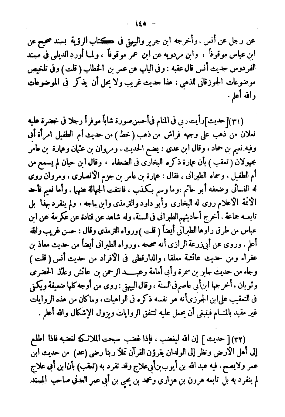 (31) [حَدِيثٌ] " رَأَيْتُ رَبِّي فِي الْمَنَامِ فِي أَحْسَنِ صُورَةٍ شَابًّا مُوَفَّرًا رَجُلا فِي خُضْرَةٍ عَلَيْهِ نَعْلانِ مِنْ ذَهَبٍ عَلَى وَجْهِهِ فَرَاشٌ مِنْ ذَهَبٍ " (خطّ) مِنْ حَدِيثِ أُمِّ الطُّفَيْلِ امْرَأَةِ أَبِي وَفِيهِ نُعَيْمُ بْنُ حَمَّادٍ، وَقَالَ ابْنُ عَدِيٍّ: يَضَعُ الْحَدِيثَ، وَمَرْوَانُ بْنُ عُثْمَانَ وَعِمَارَةُ بْنُ عَامِرٍ مَجْهُولانِ (تُعُقِّبَ) بِأَنَّ عِمَارَةَ ذَكَرَهُ الْبُخَارِيُّ فِي الضُّعَفَاءِ، وَقَالَ ابْنُ حِبَّانَ لَمْ يَسْمَعْ مِنْ أُمِّ الطُّفَيْلِ، وَسَمَّاهُ الطَّبَرَانِيُّ، فَقَالَ: عِمَارَةُ بْنُ عَامِرِ بْنِ حَزْمٍ الأَنْصَارِيُّ، وَمَرْوَانُ رَوَى لَهُ النَّسَائِيُّ وَضَعَّفَهُ أَبُو حَاتِمٍ، وَمَا وُسِمَ بِكَذِبٍ، فَانْتَفَتِ الْجَهَالَةُ عَنْهُمَا، وَأَمَّا نُعَيْمٌ فَأَحَدُ الأَئِمَّةِ الأَعْلامِ رَوَى لَهُ الْبُخَارِيُّ وَأَبُو دَاوُدَ وَالتِّرْمِذِيُّ وَابْنُ مَاجَهْ، وَلَمْ يَنْفَرِدْ بِهَذَا بَلْ تَابَعَهُ جَمَاعَةٌ، أَخْرَجَ أَحَادِيثَهُمُ الطَّبَرَانِيُّ فِي السُّنَّةِ، وَلَهُ شَاهِدٌ عَنْ قَتَادَةَ عَنْ عِكْرِمَةَ عَنِ ابْنِ عَبَّاس من طرق راوها الطَّبَرَانِيُّ أَيْضًا (قُلْتُ) وَرَوَاهُ التِّرْمِذِيُّ وَقَالَ حَسَنٌ غَرِيبٌ وَاللَّهُ أَعْلَمُ. وَرَوَى عَنْ أَبِي زُرْعَةَ الرَّازِيِّ أَنَّهُ صَحَّحَهُ، وَرَوَاهُ الطَّبَرَانِيُّ أَيْضًا من حَدِيث معَاذ بن عَفْرَاءَ وَمِنْ حَدِيثِ عَائِشَةَ مُعَلَّقًا، وَالدَّارَقُطْنِيُّ فِي الأَفْرَادِ مِنْ حَدِيثِ أَنَسٍ (قُلْتُ) وَجَاءَ مِنْ حَدِيثِ جَابِرِ بْنِ سَمُرَةَ وَأَبِي أُمَامَةَ وَعَبْدِ الرَّحْمَنِ بْنِ عَائِشٍ وَعَائِذٍ الْحَضْرَمِيِّ وَثَوْبَانَ، أَخْرَجَهَا ابْنُ أَبِي عَاصِمٍ فِي السُّنَّةِ، وَقَالَ الْبَيْهَقِيُّ: رُوِيَ مِنْ أَوْجُهٍ كُلُّهَا ضَعِيفَةٌ وَيَكْفِي فِي التَّعْقِيبِ عَلَى ابْنِ الْجَوْزِيِّ أَنَّهُ هُوَ نَفْسُهُ ذَكَرَهُ فِي الْوَاهِيَاتِ، وَمَا كَانَ مِنْ هَذِهِ الرِّوَايَاتِ غَيْرُ مُقَيَّدٍ بِالْمَنَامِ فَيَنْبَغِي أَنْ يُحْمَلَ عَلَيْهِ لِتَتَّفِقَ الرِّوَايَاتُ وَيَزُولَ الإِشْكَالُ وَاللَّهُ أَعْلَمُ.