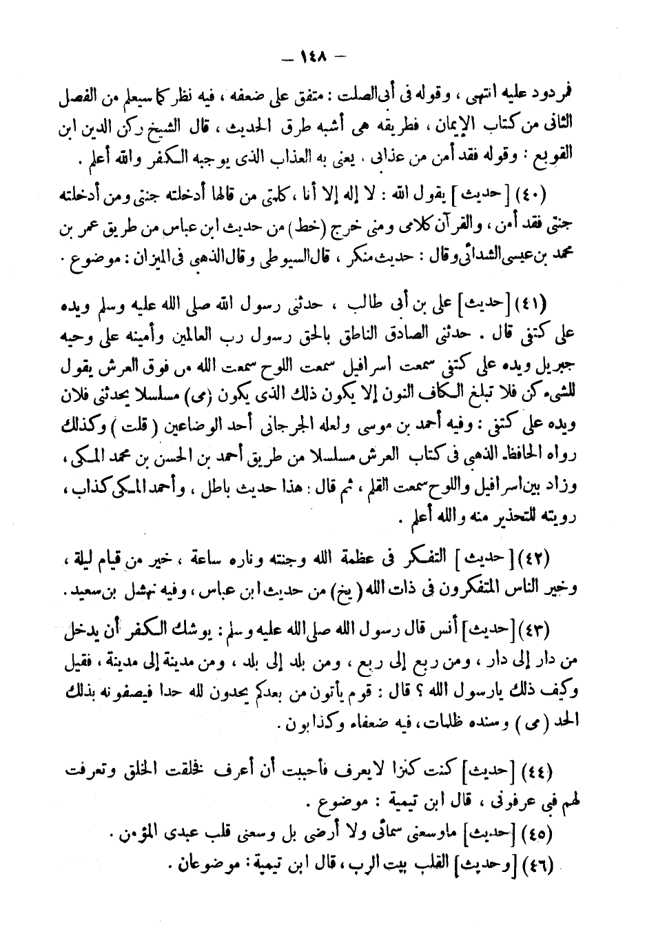 (44) [حَدِيثٌ] " كُنْتُ كَنْزًا لَا يُعْرَفُ فَأَحْبَبْتُ أَنْ أُعْرَفَ فَخَلَقْتُ الْخَلْقَ وَتَعَرَّفْتُ لَهُمْ فَبِي عَرَفُونِي، " قَالَ ابْنُ تَيْمِيَةَ: مَوْضُوعٌ.