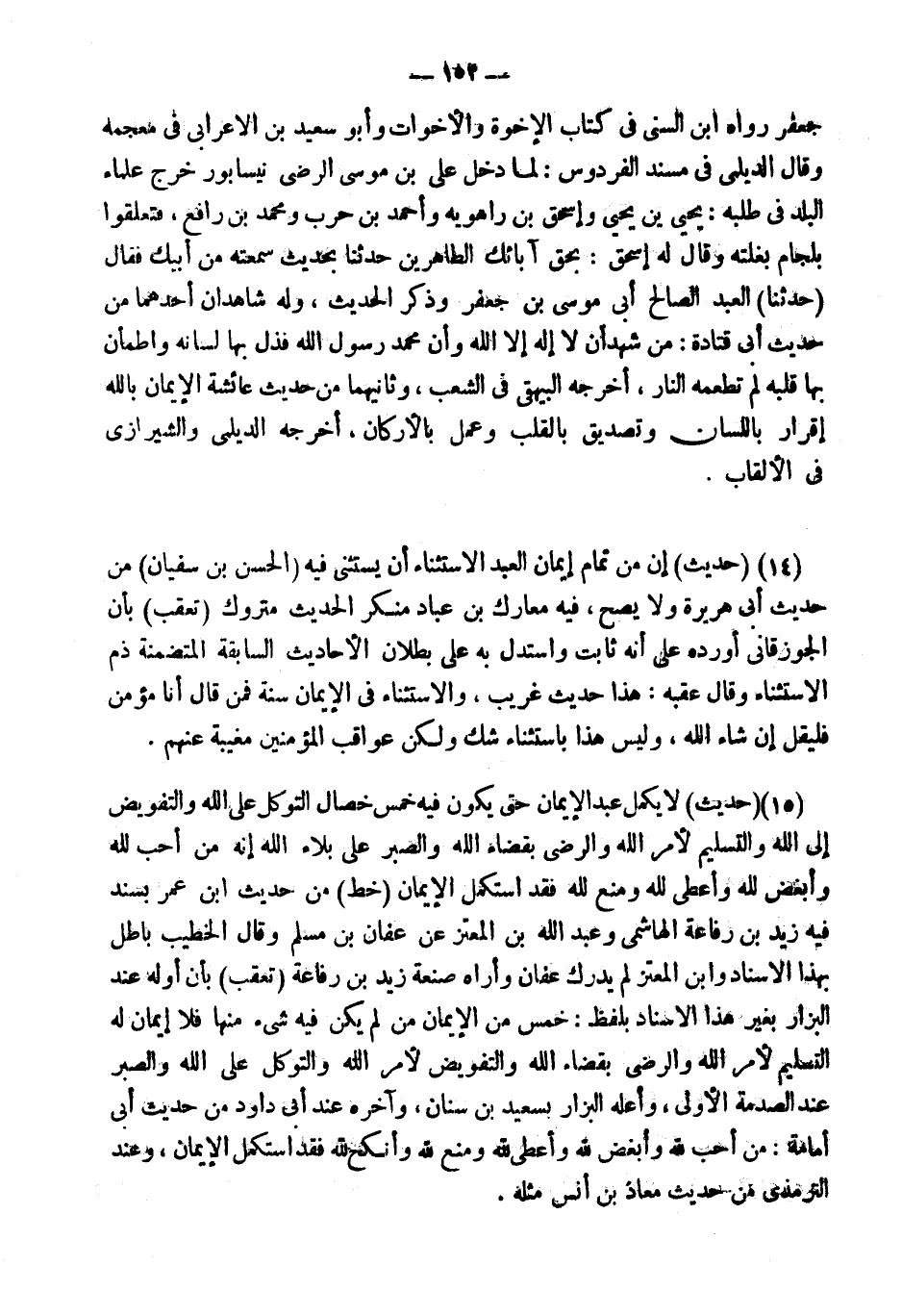 (15) (حَدِيثٌ) " لَا يكمل عبدا الإِيمَانَ حَتَّى يَكُونَ فِيهِ خَمْسُ خِصَالٍ التَّوَكُّلُ عَلَى اللَّهِ وَالتَّفْوِيضُ إِلَى اللَّهِ وَالتَّسْلِيمُ لأَمْرِ اللَّهِ وَالرِّضَى بِقَضَاءِ اللَّهِ وَالصَّبْرُ عَلَى بَلاءِ اللَّهِ إِنَّهُ مَنْ أَحَبَّ لِلَّهِ وَأَبْغَضَ لِلَّهِ وَأَعْطَى لِلَّهِ وَمَنَعَ لِلَّهِ فَقَدِ اسْتَكْمَلَ الإِيمَانَ " (خطّ) مِنْ حَدِيثِ ابْنِ عُمَرَ بِسَنَدٍ فِيهِ زَيْدُ بْنُ رِفَاعَةَ الْهَاشِمِيُّ وَعَبْدُ اللَّهِ بْنُ الْمُعْتَزِّ عَنْ عَفَّانَ بْنِ مُسْلِمٍ وَقَالَ الْخَطِيبُ بَاطِلٌ بِهَذَا الإِسْنَادِ وَابْنُ الْمُعْتَزِّ لَمْ يُدْرِكْ عَفَّانَ وَأَرَاهُ صَنْعَةَ زَيْدِ بْنِ رِفَاعَةَ (تُعُقِّبَ) بِأَنَّ أَوَّلَهُ عِنْدَ الْبَزَّارِ بِغَيْرِ هَذَا الإِسْنَادِ بِلَفْظِ: " خَمْسٌ مِنَ الإِيمَانِ مَنْ لَمْ يَكُنْ فِيهِ شئ مِنْهَا فَلا إِيمَانَ لَهُ التَّسْلِيمُ لأَمْرِ اللَّهِ وَالرِّضَى بِقَضَاءِ اللَّهِ وَالتَّفْوِيضُ لأَمْرِ اللَّهِ وَالتَّوَكُّلُ عَلَى اللَّهِ وَالصَّبْرُ عِنْدَ الصَّدْمَةِ الأُولَى "، وَأَعَلَّهُ الْبَزَّارُ بِسَعِيدِ بْنِ سِنَانٍ، وَآخِرُهُ عِنْدَ أَبِي دَاوُدَ مِنْ حَدِيثِ أَبِي أُمَامَةَ: " مَنْ أَحَبَّ لِلَّهِ وَأَبْغَضَ لِلَّهِ وَأَعْطَى لِلَّهِ وَمَنَعَ لِلَّهِ وَأَنْكَحَ لِلَّهِ فَقَدِ اسْتَكْمَلَ الإِيمَانَ "، وَعِنْدَ التِّرْمِذِيِّ مِنْ حَدِيثِ مُعَاذِ بْنِ أَنَسٍ مِثْلَهُ.