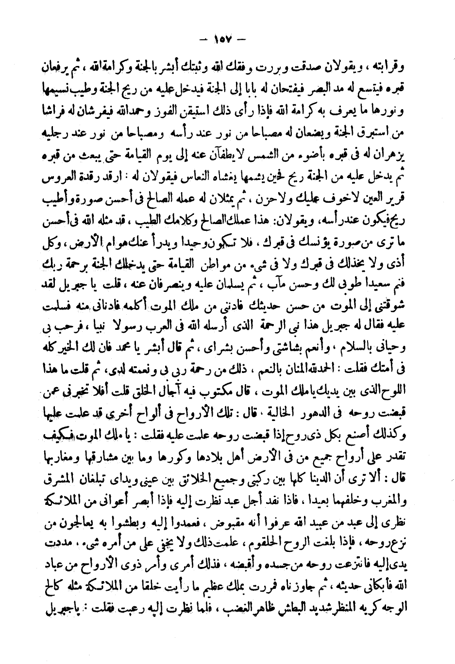 وَقَرَابَتِهِ، وَيَقُولانِ صَدَقْتَ وَبَرَرْتَ وَفَّقَكَ اللَّهُ وَثَبَّتَكَ أَبْشِرْ بِالْجَنَّةِ وَكَرَامَةِ اللَّهِ، ثُمَّ يَرْفَعَانِ قَبْرَهُ فَيَتَّسِعَ لَهُ مَدَّ الْبَصَرِ فَيَفْتَحَانِ لَهُ بَابًا إِلَى الْجَنَّةِ فَيَدْخُلُ عَلَيْهِ مِنْ رِيحِ الْجَنَّةِ وَطِيبِ نَسِيمِهَا وَنُورِهَا مَا يُعْرَفُ بِهِ كَرَامَةُ اللَّهِ فَإِذَا رَأَى ذَلِكَ اسْتَيْقَنَ الْفَوْزَ وَحَمِدَ اللَّهَ فَيَفْرِشَانِ لَهُ فِرَاشًا مِنْ إِسْتَبْرَقِ الْجَنَّةِ وَيَضَعَانِ لَهُ مِصْبَاحًا مِنْ نُورٍ عِنْدَ رَأْسِهِ وَمِصْبَاحًا مِنْ نُورٍ عِنْدَ رِجْلَيْهِ يُزْهِرَانِ لَهُ فِي قَبْرِهِ بِأَضْوَءَ مِنَ الشَّمْسِ لَا يُطْفَآنِ عَنْهُ إِلَى يَوْمِ الْقِيَامَةِ حَتَّى يُبْعَثَ مِنْ قَبْرِهِ ثُمَّ يَدْخُلُ عَلَيْهِ مِنَ الْجَنَّةِ رِيحٌ فَحِينَ يَشُمُّهَا يَغْشَاهُ النُّعَاسُ فَيَقُولانِ لَهُ: ارْقُدْ رَقْدَةَ الْعَرُوسِ قَرِيرَ الْعَيْنِ لَا خَوْفٌ عَلَيْكَ وَلا حَزَنٌ، ثُمَّ يُمَثِّلانِ لَهُ عَمَلَهُ الصَّالِحَ فِي أَحْسَنِ صُورَةٍ وَأَطْيَبِ رِيحٍ فَيَكُونُ عِنْدَ رَأْسِهِ، وَيَقُولانِ: هَذَا عَمَلُكَ الصَّالِحُ وَكَلامُكَ الطَّيِّبُ، قَدْ مَثَّلَهُ اللَّهُ فِي أَحْسَنِ مَا تَرَى مِنْ صُورَةٍ يُؤْنِسُكَ فِي قَبْرِكَ، فَلا تَكُونُ وَحِيدًا وَيَدْرَأُ عَنْكَ هَوَامَّ الأَرْضِ، وَكُلَّ أَذًى وَلا يَخْذُلُكَ فِي قَبْرِكَ وَلا فى شئ مِنْ مَوَاطِنِ الْقِيَامَةِ حَتَّى يُدْخِلَكَ الْجَنَّةَ بِرَحْمَةِ رَبِّكَ فَنَمْ سَعِيدًا طُوبَى لَكَ وَحُسْنُ مَآبٍ، ثُمَّ يُسَلِّمَانِ عَلَيْهِ وَيَنْصَرِفَانِ عَنْهُ، قُلْتُ يَا جِبْرِيلُ لَقَدْ شَوَّقْتَنِي إِلَى الْمَوْتِ مِنْ حُسْنِ حَدِيثِكَ فَادْنُنِي مِنْ مَلَكِ الْمَوْتِ أُكَلِّمُهُ فَأَدْنَانِي مِنْهُ فَسَلَّمْتُ عَلَيْهِ فَقَالَ لَهُ جِبْرِيلُ هَذَا نَبِيُّ الرَّحْمَةِ الَّذِي أَرْسَلَهُ اللَّهُ فِي الْعَرَبِ رَسُولا نَبِيًّا، فَرَحَّبَ بِي وَحَيَّانِي بِالسَّلامِ، وَأَنْعَمَ بَشَاشَتِي وَأَحْسَنَ بُشْرَايَ، ثُمَّ قَالَ أَبْشِرْ يَا مُحَمَّدُ فَإِنَّ لَكَ الْخَيْرَ كُلَّهُ فِي أُمَّتِكَ فَقُلْتُ: الْحَمْدُ لِلَّهِ الْمَنَّانِ بِالنِّعَمِ، ذَلِكَ مِنْ رَحْمَةِ رَبِّي بِي وَنِعْمَتِهِ لَدَيَّ، ثُمَّ قُلْتُ مَا هَذَا اللَّوْحُ الَّذِي بَيْنَ يَدَيْكَ يَا مَلَكَ الْمَوْتِ، قَالَ مَكْتُوبٌ فِيهِ آجَالُ الْخَلْقِ قُلْتُ أَفَلا تُخْبِرُنِي عَمَّنْ قَبَضْتَ رُوحَهُ فِي الدُّهُورِ الْخَالِيَةِ، قَالَ: تِلْكَ الأَرْوَاحُ فِي أَلْوَاحٍ أُخْرَى قَدْ عَلَّمْتُ عَلَيْهَا وَكَذَلِكَ أَصْنَعُ بِكُلِّ ذِي رُوحٍ إِذَا قَبَضْتُ رُوحَهُ عَلَّمْتُ عَلَيْهِ فَقُلْتُ: يَا مَلَكَ الْمَوْتِ فَكَيْفَ تَقْدِرُ عَلَى أَرْوَاحِ جَمِيعِ مَنْ فِي الأَرْضِ أَهْلِ بِلادِهَا وَكُورِهَا وَمَا بَيْنَ مَشَارِقِهَا وَمَغَارِبِهَا قَالَ: أَلا ترى أَن الدِّينَا كُلَّهَا بَيْنَ رُكْبَتَيَّ وَجَمِيعَ الْخَلائِقِ بَيْنَ عَيْنَيَّ وَيَدَايَ تَبْلُغَانِ الْمَشْرِقَ وَالْمَغْرِبَ وَخَلْفَهُمَا بَعِيدًا، فَإِذَا نَفِدَ أَجَلُ عَبْدٍ نَظَرْتُ إِلَيْهِ فَإِذَا أَبْصَرَ أَعْوَانِي مِنَ الْمَلائِكَةِ نَظَرِي إِلَى عَبْدٍ مِنْ عَبِيدِ اللَّهِ عَرَفُوا أَنَّهُ مَقْبُوضٌ، فَعَمِدُوا إِلَيْهِ وَبَطَشُوا بِهِ يُعَالِجُونَ مِنْ نَزْعِ رُوحِهِ، فَإِذَا بَلَغَتِ الرُّوحُ الْحُلْقُومَ، عَلِمْتُ ذَلِكَ وَلا يَخْفَى عَلَيَّ من أمره شئ، مَدَدْتُ يَدِي إِلَيْهِ فَانْتَزَعْتُ رُوحَهُ مِنْ جَسَدِهِ وَأَقْبِضُهُ، فَذَلِكَ أَمْرِي وَأَمْرُ ذَوِي الأَرْوَاحِ مِنْ عِبَادِ اللَّهِ فَأَبْكَانِي حَدِيثُهُ، ثُمَّ جَاوَزْنَاهُ فَمَرَرْتُ بِمَلَكٍ عَظِيمٍ مَا رَأَيْتُ خَلْقًا مِنَ الْمَلائِ