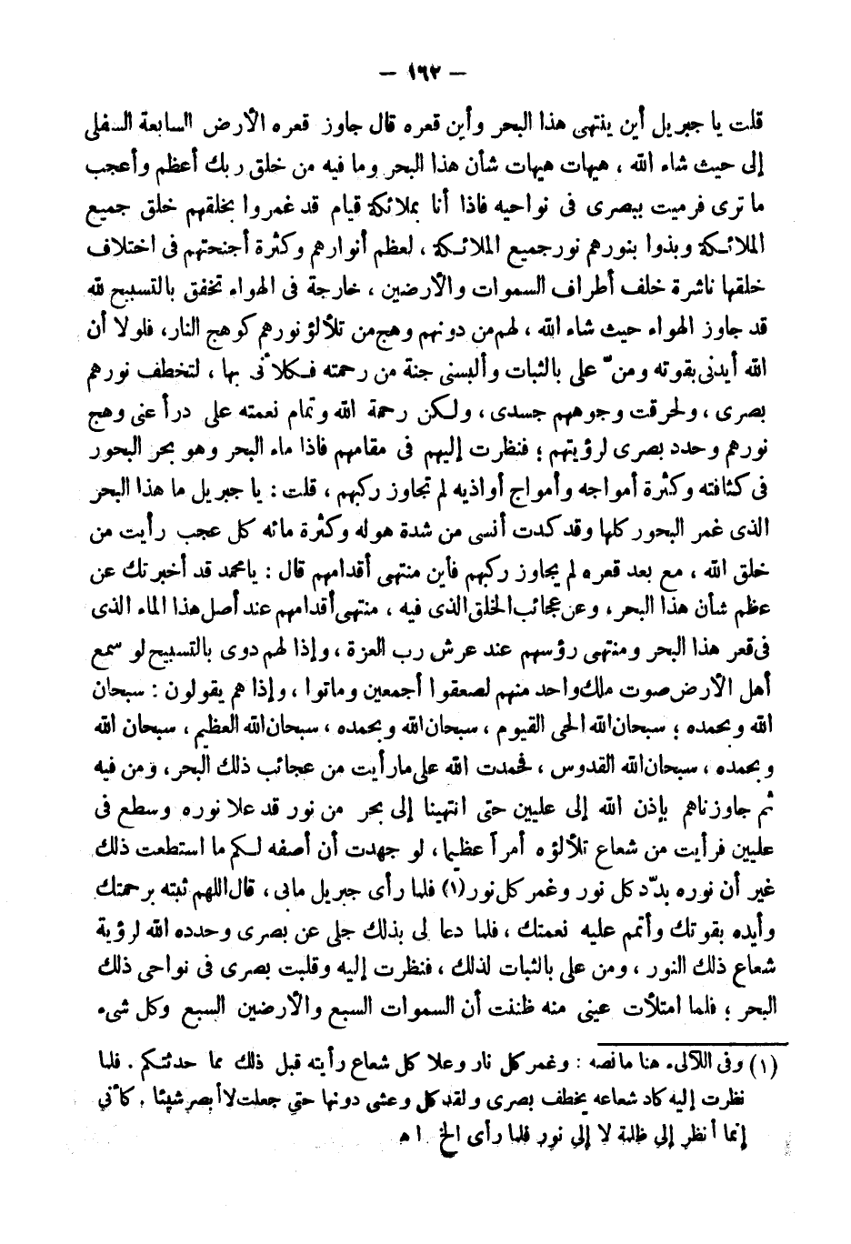 قُلْتُ يَا جِبْرِيلُ أَيْنَ يَنْتَهِي هَذَا الْبَحْرُ وَأَيْنَ قَعْرُهُ قَالَ جَاوَزَ قَعْرُهُ الأَرْضَ السَّابِعَةَ السُّفْلَى إِلَى حَيْثُ شَاءَ اللَّهُ، هَيْهَاتَ هَيْهَاتَ شَأْنُ هَذَا الْبَحْرِ وَمَا فِيهِ مِنْ خَلْقِ رَبِّكَ أَعْظَمُ وَأَعْجَبُ مَا تَرَى فَرَمَيْتُ بِبَصَرِي فِي نَوَاحِيهِ فَإِذَا أَنَا بِمَلائِكَةٍ قِيَامٍ قَدْ غَمَرُوا بِخَلْقِهِمْ خَلْقَ جَمِيعِ الْمَلائِكَةِ وَبَذُّوا بِنُورِهِمْ نُورَ جَمِيعِ الْمَلائِكَةِ، لِعِظَمِ أَنْوَارِهِمْ وَكَثْرَةِ أَجْنِحَتِهِمْ فِي اخْتِلافِ خَلْقِهَا نَاشِرَةً خَلْفَ أَطْرَافِ السَّمَوَاتِ وَالأَرَضِينَ، خَارِجَةً فِي الْهَوَاءِ تَخْفِقُ بِالتَّسْبِيحِ لِلَّهِ قَدْ جَاوَزَ الْهَوَاءَ حَيْثُ شَاءَ اللَّهُ، لَهُمْ مِنْ دُونِهِمْ وَهَجٌ مِنْ تَلأْلُؤِ نُورِهِمْ كَوَهَجِ النَّارِ، فَلَوْلا أَنَّ اللَّهَ أَيَّدَنِي بِقُوَّتِهِ وَمَنَّ عَلَيَّ بِالثَّبَاتِ وَأَلْبَسَنِي جَنَّةً مِنْ رَحْمَتِهِ فَكَلأَنِي بِهَا، لَتَخَطَّفَ نُورُهُمْ بَصَرِي، وَلَحَرَقَتْ وُجُوهُهُمْ جَسَدِي، وَلَكِنَّ رَحْمَةَ اللَّهِ وَتَمَامَ نِعْمَتِهِ عَلَيَّ دَرَأَ عَنِّي وَهَجَ نُورِهِمْ وَحَدَّدَ بَصَرِي لِرُؤْيَتِهِمْ؛ فَنَظَرْتُ إِلَيْهِمْ فِي مَقَامِهِمْ فَإِذَا مَاءُ الْبَحْرِ وَهُوَ بَحْرُ الْبُحُورِ فِي كَثَافَتِهِ وَكَثْرَةِ أَمْوَاجِهِ وَأَمْوَاجِ أَوَاذِيِّهِ لَمْ تُجَاوِزْ رُكَبَهُمْ، قُلْتُ: يَا جِبْرِيلُ مَا هَذَا الْبَحْرُ الَّذِي غَمَرَ الْبُحُورَ كُلَّهَا وَقَدْ كِدْتُ أَنْسَى مِنْ شِدَّةِ هَوْلِهِ وَكَثْرَةِ مَائِهِ كُلَّ عَجَبٍ رَأَيْتُ مِنْ خَلْقِ اللَّهِ، مَعَ بُعْدِ قَعْرِهِ لَمْ يُجَاوِزْ رُكَبَهُمْ فَأَيْنَ مُنْتَهَى أَقْدَامِهِمْ قَالَ: يَا مُحَمَّدُ قَدْ أَخْبَرْتُكَ عَنْ عِظَمِ شَأْنِ هَذَا الْبَحْرِ، وَعَنْ عَجَائِبِ الْخَلْقِ الَّذِي فِيهِ، مُنْتَهَى أَقْدَامُهُمْ عِنْدَ أَصْلِ هَذَا الْمَاءِ الَّذِي فِي قَعْرِ هَذَا الْبَحْر ومنتهى رُؤْسهمْ عِنْدَ عَرْشِ رَبِّ الْعِزَّةِ، وَإِذَا لَهُمْ دَوِيٌّ بِالتَّسْبِيحِ لَوْ سَمِعَ أَهْلُ الأَرْضِ صَوْتَ مَلَكٍ وَاحِدٍ مِنْهُمْ لَصَعِقُوا أَجْمَعِينَ وَمَاتُوا، وَإِذَا هُمْ يَقُولُونَ: سُبْحَانَ اللَّهِ وَبِحَمْدِهِ؛ سُبْحَانَ اللَّهِ الْحَيِّ الْقَيُّومِ، سُبْحَانَ اللَّهِ وَبِحَمْدِهِ، سُبْحَانَ اللَّهِ الْعَظِيمِ، سُبْحَانَ اللَّهِ وَبِحَمْدِهِ، سُبْحَانَ اللَّهِ الْقُدُّوسِ، فَحَمِدْتُ اللَّهَ عَلَى مَا رَأَيْتُ مِنْ عَجَائِبِ ذَلِكَ الْبَحْرِ، وَمَنْ فِيهِ ثُمَّ جَاوَزْنَاهُمْ بِإِذْنِ اللَّهِ إِلَى عِلِّيِّينَ حَتّى انْتَهَيْنَا إِلَى بَحْرٍ مِنْ نُورٍ قَدْ عَلا نُورُهُ وَسَطَعَ فِي عِلِّيِّينَ فَرَأَيْتُ مِنْ شُعَاعِ تَلأْلُؤِهِ أَمْرًا عَظِيمًا، لَوْ جَهِدْتُ أَنْ أَصِفَهُ لَكُمْ مَا اسْتَطَعْتُ ذَلِكَ غَيْرَ أَنَّ نُورَهُ بَدَّدَ كُلَّ نُورٍ وَغَمَرَ كُلَّ نُورٍ فَلَمَّا رَأَى جِبْرِيلُ مَا بِي، قَالَ اللَّهُمَّ ثَبِّتْهُ بِرَحْمَتِكَ وَأَيِّدْهُ بِقُوَّتِكَ وَأَتْمِمْ عَلَيْهِ نِعْمَتَكَ، فَلَمَّا دَعَا لِي بِذَلِكَ جُلِّيَ عَنْ بَصَرِي وَحَدَّدَهُ اللَّهُ لِرُؤْيَةِ شُعَاعِ ذَلِكَ النُّورِ، وَمَنَّ عَلَيَّ بِالثَّبَاتِ لِذَلِكَ، فَنَظَرْتُ إِلَيْهِ وَقَلَّبْتُ بَصَرِي فِي نَوَاحِي ذَلِكَ الْبَحْرِ؛ فَلَمَّا امْتَلأَتْ عَيْنِي مِنْهُ ظَنَنْتُ أَنَّ السَّمَوَاتِ السَّبْعَ وَالْأَرضين السَّبع وكل شئ