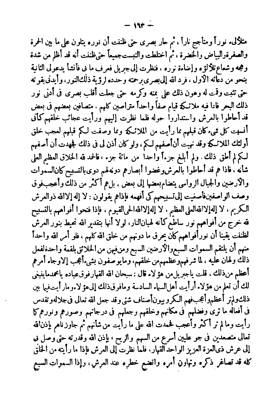 مُتَلأْلِئٌ نُورًا وَمُتَأَجِّجٌ نَارًا، ثُمَّ حَارَ بَصَرِي حَتَّى ظَنَنْتُ أَنَّ نُورَهُ يَتَلَوَّنُ عَلَى مَا بَيْنَ الْحُمْرَةِ وَالصُّفْرَةِ وَالْبَيَاضِ وَالْخُضْرَةِ، ثُمَّ اخْتَلَطَتْ وَالْتَبَسَتْ جَمِيعًا حَتَّى ظَنَنْتُ أَنَّهُ قَدْ أَظْلَمَ مِنْ شِدَّةِ وَهَجِهِ وَشُعَاعِ تَلأْلُؤِهِ وَإِضَاءَةِ نُورِهِ، فَنَظَرْتُ إِلَى جِبْرِيلَ فَعَرَفَ مَا بِي فَأَنْشَأَ يَدْعُو لِي الثَّانِيَةَ بِنَحْوٍ مِنْ دُعَائِهِ الأَوَّلِ، فَرَدَّ اللَّهُ إِلَيَّ بَصَرِي بِرَحْمَتِهِ وَحَدَّدَهُ لِرُؤْيَةِ ذَلِكَ النُّورِ، وَأَيَّدَنِي بِقُوَّتِهِ حَتَّى تَثَبَّتُّ وَقُمْتُ لَهُ وَهَوَّنَ ذَلِكَ عَلَيَّ بِمَنِّهِ وَكَرَمِهِ حَتَّى جَعَلْتُ أُقَلِّبُ بَصَرِي فِي أَدْنَى نور ذَلِك الْبَحْر فادا فِيهِ مَلائِكَةٌ قِيَامٌ صَفًّا وَاحِدًا مُتَرَاصِّينَ كُلُّهُمْ، مُتَصَافِّينَ بَعْضُهُمْ فِي بَعْضٍ قَدْ أَحَاطُوا بِالْعَرْشِ وَاسْتَدَارُوا حَوْلَهُ فَلَمَّا نَظَرْتُ إِلَيْهِمْ وَرَأَيْتُ عَجَائِبَ خَلْقِهِمْ كَأَنِّي أُنْسِيتُ كُلَّ شئ كَانَ قَبْلَهُمْ مِمَّا رَأَيْتُ مِنَ الْمَلائِكَةِ وَمِمَّا وَصَفْتُ لَكُمْ قَبْلَهُمْ لِعَجَبِ خَلْقِ أُولَئِكَ الْمَلائِكَةِ وَقَدْ نُهِيتُ أَنْ أَصِفَهُمْ لَكُمْ، وَلَوْ كَانَ أُذِنَ لِي فِي ذَلِكَ فَجَهِدْتُ أَنْ أَصِفَهُمْ لَكُمْ لَمْ أَطِقْ ذَلِكَ، وَلَمْ أُبَلِّغْ جُزْءًا وَاحِدًا مِنْ مِائَةِ جُزْءٍ، فَالْحَمْدُ لِلَّهِ الْخَلاقِ الْعَظِيمِ الْعَلِيِّ شَأْنُهُ، فَإِذَا هُمْ قَدْ أَحَاطُوا بِالْعَرْشِ وَغَضُّوا أَبْصَارَهُمْ دُونَهُ لَهُمْ دَوِيٌّ بِالتَّسْبِيحِ كَأَنَّ السَّمَوَاتِ وَالأَرَضِينَ وَالْجِبَالَ الرَّوَاسِيَ يَتَضَامُّ بَعْضُهَا إِلَى بَعْضٍ، بَلْ هُمْ أَكْثَرُ مِنْ ذَلِكَ وَأَعْجَبُ فَوْقَ وَصْفِ الْوَاصِفِينَ فَأَصْغَيْتُ إِلَى تَسْبِيحِهِمْ كَيْ أَفْهَمَهُ فَإِذَا هُمْ يَقُولُونَ: لَا إِلَهَ إِلا اللَّهُ ذُو الْعَرْشِ الْكَرِيمِ، لَا إِلَهَ إِلا اللَّهُ الْعَلِيُّ الْعَظِيمُ، لَا إِلَهَ إِلا اللَّهُ الْحَيُّ الْقَيُّومُ، فَإِذَا فَتَحُوا أَفْوَاهَهُمْ بِالتَّسْبِيحِ لِلَّهِ خَرَجَ مِنْ أَفْوَاهِهِمْ نُورٌ سَاطِعٌ كَأَنَّهُ لَهَبَانُ النَّارِ، لَوْلا أَنَّهَا بِتَقْدِيرِ اللَّهِ تُحِيطُ بِنُورِ الْعَرْشِ لَظَنَنْتُ يَقِينًا أَنَّ نُورَ أَفْوَاهِهِمْ كَانَ يَحْرِقُ مَا دُونَهُمْ مِنْ خَلْقِ اللَّهِ كُلِّهِمْ، فَلَوْ أَمَرَ اللَّهُ وَاحِدًا مِنْهُمْ أَنَّهُ يَلْتَقِمُ السَّمَوَاتِ السَّبْعَ وَالأَرَضِينَ السَّبْعَ وَمَنْ فِيهِنَّ مِنَ الْخَلائِقِ بِلُقْمَةٍ وَاحِدَةٍ لَفَعَلَ ذَلِكَ وَلَهَانَ عَلَيْهِ، لِمَا شَرَّفَهُمْ وَعَظَّمَهُمْ مِنْ خَلْقِهِمْ، وَمَا يوصفون بشئ أَعْجَبَ إِلا وَجَاءَ أَمْرُهُمْ أَعْظَمُ مِنْ ذَلِكَ، قُلْتُ يَا جِبْرِيلُ مَنْ هَؤُلاءِ قَالَ: سُبْحَانَ اللَّهِ الْقَهَّارِ فَوْقَ عِبَادِهِ يَا مُحَمَّدُ مَا يَنْبَغِي لَكَ أَنْ تَعْلَمَ مَنْ هَؤُلاءِ أَرَأَيْتَ أَهْلَ السَّمَاءِ السَّادِسَةِ وَمَا فَوْقَ ذَلِكَ إِلَى هَؤُلاءِ وَمَا رَأَيْتَ فِيمَا بَيْنَ ذَلِكَ وَلَمْ تَرَ أَعْظَمَ وَأَعْجَبَ فَهُمُ الْكُرُوبِيُّونَ أَصْنَافٌ شَتَّى وَقَدْ جَعَلَ اللَّهُ تَعَالَى فِي جَلالِهِ وَتَقَدَّسَ فِي أَفْعَالِهِ مَا تَرَى وَفَضَّلَهُمْ فِي مَكَانِهِمْ وَخَلْقِهِمْ وَجَعَلَهُمْ فِي دَرَجَاتِهِمْ وَصَوَّرَهُمْ وَنَوَّرَهُمْ كَمَا رَأَيْتَ وَمَا لَمْ تَرَ أَكْثَرَ وَأَعْجَبَ فَحَمِدْتُ اللَّهَ عَلَى مَا رَأَيْتُ مِنْ شَأْنِهِمْ ثُمَّ جَاوَزْنَاهُمْ بِإِذْنِ اللَّهِ تَعَالَى مُتَصَعِّدِينَ فِي جَوِّ عِلِّيِّينَ أَسْرَعَ مِنَ السَّهْمِ وَالرِّيحِ، بِإِذْنِ اللَّهِ وَقُدْرَتِهِ حَتَّى وَص