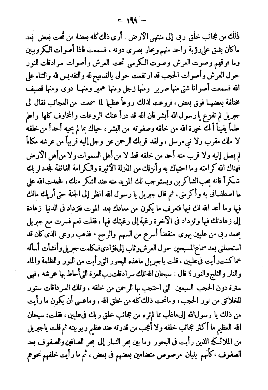 ذَلِكَ مِنْ عَجَائِبِ خَلْقِ رَبِّي إِلَى مُنْتَهَى الأَرْضِ أَرَى ذَلِكَ كُلَّهُ بَعْضَهُ مِنْ تَحْتِ بَعْضٍ بَعْدَ مَا كَانَ يَشُقُّ عَلَيَّ رُؤْيَةُ وَاحِدٍ مِنْهُمْ وَيَحَارُ بَصَرِي دُونَهُ، فَسَمِعْتُ فَإِذَا أَصْوَاتُ الْكُرُوبِيِّينَ وَمَا فَوْقَهُمْ وَصَوْتُ الْعَرْشِ وَصَوْتُ الْكُرْسِيِّ تَحْتَ الْعَرْشِ وَأَصْوَاتُ سُرَادِقَاتِ النُّورِ حَوْلَ الْعَرْشِ وَأَصْوَاتُ الْحُجُبِ قَدِ ارْتَفَعَتْ حَوْلِي بِالتَّسْبِيحِ لِلَّهِ وَالتَّقْدِيسِ لِلَّهِ وَالثَّنَاءِ عَلَى اللَّهِ فَسَمِعْتُ أَصْوَاتًا شَتَّى مِنْهَا صَرِيرٌ وَمِنْهَا زَجَلٌ وَمِنْهَا هَمِيرٌ وَمِنْهَا دَوِيٌّ وَمِنْهَا قَصِيفٌ مُخْتَلِفَةٌ بَعْضُهَا فَوْقَ بَعْضٍ، فَرُوِّعْتُ لِذَلِكَ رَوْعًا عَظِيمًا لِمَا سَمِعْتُ مِنَ الْعَجَائِبِ فَقَالَ لِي جِبْرِيلُ لِمَ تَفْزَعُ يَا رَسُولَ اللَّهِ أَبْشِرْ فَإِنَّ اللَّهَ قَدْ دَرَأَ عَنْكَ الرَّوْعَاتِ وَالْمَخَاوِفَ كُلَّهَا وَاعْلَمْ عِلْمًا يَقِينًا أَنَّكَ خِيرَةُ اللَّهِ مِنْ خَلْقِهِ وَصَفْوَتُهُ مِنَ الْبَشَرِ، حَبَاكَ بِمَا لَمْ يُحْبِهِ أَحَدًا مِنْ خَلْقِهِ لَا مَلَكٌ مُقَرَّبٌ وَلا نَبِيٌّ مُرْسَلٌ، وَلَقَدْ قَرَّبَكَ الرَّحْمَنُ عَزَّ وَجَلَّ إِلَيْهِ قَرِيبًا مِنْ عَرْشِهِ مَكَانًا لَمْ يَصِلْ إِلَيْهِ وَلا قُرِّبَ مِنْهُ أَحَدٌ مِنْ خَلْقِهِ قَطُّ لَا مِنْ أَهْلِ السَّمَوَاتِ وَلا مِنْ أَهْلِ الأَرْضِ فَهَنَاكَ اللَّهُ كَرَامَتَهُ وَمَا احْتَبَاكَ بِهِ وَأَنْزَلَكَ مِنَ الْمَنْزِلَةِ الأَثِيرَةِ وَالْكَرَامَةِ الْفَائِقَةِ فَجَدِّدْ لِرَبِّكَ شُكْرًا فَإِنَّهُ يُحِبُّ الشَّاكِرِينَ وَيَسْتَوْجِبُ لَكَ الْمَزِيدَ مِنْهُ عِنْدَ الشُّكْرِ مِنْكَ، فَحَمِدْتُ اللَّهَ عَلَى مَا اصْطَفَانِي بِهِ وَأَكْرَمَنِي، ثُمَّ قَالَ جِبْرِيلُ يَا رَسُولَ اللَّهِ انْظُرْ إِلَى الْجَنَّةِ حَتَّى أريك مَالك فِيهَا وَمَا أَعَدَّ اللَّهُ لَكَ فِيهَا فَتَعْرِفَ مَا يَكُونُ مِنْ مَعَادِكَ بَعْدَ الْمَوْتِ فَتَزْدَادَ فِي الدُّنْيَا زَهَادَةً إِلَى زَهَادَتِكَ فِيهَا وَتَزْدَادَ فِي الآخِرَةِ رَغْبَةً إِلَى رَغْبَتِكَ فِيهَا، فَقُلْتُ نَعَمْ فَسِرْتُ مَعَ جِبْرِيلَ بِحَمْدِ رَبِّي مِنْ عِلِّيِّينَ يَهْوِي مُنْقَضًّا أَسْرَعَ مِنَ السَّهْمِ وَالرُّمْحِ، فَذَهَبَ رَوْعِي الَّذِي كَانَ قَدِ اسْتَحْمَلَنِي بَعْدَ سَمَاعِ الْمُسَبِّحِينَ حَوْلَ الْعَرْشِ وَثَابَ إِلَيَّ فُؤَادِي فَكَلَّمْتُ جِبْرِيلَ وَأَنْشَأْتُ أَسْأَلُهُ عَمَّا كُنْتُ رَأَيْتُ فِي عِلِّيِّينَ، قُلْتُ يَا جِبْرِيلُ مَا هَذِهِ الْبُحُورُ الَّتِي رَأَيْتُ مِنَ النُّورِ وَالظُّلْمَةِ وَالْمَاءِ وَالنَّارِ وَالثَّلْجِ وَالنُّورِ؟ قَالَ: سُبْحَانَ اللَّهِ تِلْكَ سُرَادِقَاتُ رَبِّ الْعِزَّةِ الَّتِي أَحَاطَ بِهَا عَرْشَهُ، فَهِيَ سُتْرَةٌ دُونَ الْحُجُبِ السَّبْعِينَ الَّتِي احْتَجَبَ بِهَا الرَّحْمَنُ من خلقه، وَتلك السرداقات سُتُورٌ لِلْخَلائِقِ مِنْ نُورِ الْحُجُبِ، وَمَا تَحْتَ ذَلِكَ كُلِّهِ مِنْ خَلْقِ اللَّهِ، وَمَا عَسَى أَنْ يَكُونَ مَا رَأَيْتَ مِنْ ذَلِكَ يَا رَسُولَ اللَّهِ إِلَى مَا غَابَ مِمَّا لَمْ تَرَهُ مِنْ عَجَائِبِ خَلْقِ رَبِّكَ فِي عِلِّيِّينَ، فَقُلْتُ: سُبْحَانَ اللَّهِ الْعَظِيمِ مَا أَكْثَرَ عَجَائِبَ خَلْقِهِ وَلا أَعْجَبَ مِنْ قُدْرَتِهِ عِنْدَ عَظِيمِ رُبُوبِيَّتِهِ ثُمَّ قُلْتُ يَا جِبْرِيلُ مَنِ الْمَلائِكَةُ الَّذِينَ رَأَيْتُ فِي الْبُحُورِ وَمَا بَيْنَ بَحْرِ النَّارِ إِلَى بَحْرِ الصَّافِّينَ وَالصُّفُوفُ بَعْدَ الصُّفُوفِ، كَأَنَّهُمْ بُنْيَانٌ مَرْصُوصٌ مُتَضَامِّينَ بَعْضُهُمْ فِي بَعْضٍ، ثُمَّ مَا رَأَيْتُ خَلفهم نحوهم