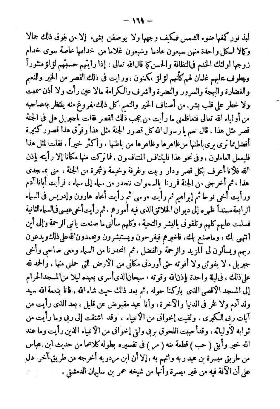 لَبَذَّ نُورُ كَفِّهَا ضَوْءَ الشَّمْسِ فَكيف وَجههَا وَلَا يوصفن بشئ إِلا مِنْ فَوْقِ ذَلِكَ جَمَالا وَكَمَالا لِكُلِّ وَاحِدَةٍ مِنْهُنَّ سَبْعُونَ خَادِمًا وَسَبْعُونَ غُلامًا مِنْ خُدَّامِهَا خَاصَّةً سِوَى خُدَّامِ زَوْجِهَا أُولَئِكَ الْخَدَمُ فِي النَّظَافَةِ وَالْحُسْنِ كَمَا قَالَ اللَّهُ تَعَالَى: إِذَا رَأَيْتَهُمْ حسبتهم لُؤْلُؤ منثورا وَيَطُوفُ عَلَيْهِمْ غِلْمَانٌ لَهُمْ كَأَنَّهُمْ لُؤْلُؤ مَكْنُون، وَرَأَيْتُ فِي ذَلِكَ الْقَصْرِ مِنَ الْخَيْرِ وَالنَّعِيمِ وَالْغَضَارَةِ وَالْبَهْجَةِ وَالسُّرُورِ وَالنَّضْرَةِ وَالشَّرَفِ وَالْكَرَامَةِ مَا لَا عَيْنٌ رَأَتْ وَلا أُذُنٌ سَمِعَتْ وَلا خَطَرَ عَلَى قَلْبِ بَشَرٍ، مِنْ أَصْنَافِ الْخَيْرِ وَالنَّعِيمِ كُلُّ ذَلِكَ مَفْرُوغٌ مِنْهُ يَنْتَظِرُ بِهِ صَاحِبَهُ مِنْ أَوْلِيَاءِ اللَّهِ تَعَالَى فَتَعَاظَمَنِي مَا رَأَيْتُ مِنْ عَجَبِ ذَلِكَ الْقَصْرِ فَقُلْتُ يَا جِبْرِيلُ هَلْ فِي الْجَنَّةِ قَصْرٌ مِثْلُ هَذَا، قَالَ نَعَمْ يَا رَسُولَ اللَّهِ كُلُّ قُصُورِ الْجَنَّةِ مِثْلُ هَذَا وَفَوْقَ هَذَا قُصُورٌ كَثِيرَةٌ أَفْضَلُ مِمَّا تَرَى يُرَى بَاطِنُهَا مِنْ ظَاهِرِهَا وَظَاهِرُهَا مِنْ بَاطِنِهَا، وَأَكْثَرُ خَيْرًا، فَقُلْتُ لِمِثْلِ هَذَا فليعمل الْعَامِلُونَ، وَفِي نَحْوِ هَذَا فَلْيَتَنَافَسِ الْمُتَنَافِسُونَ، فَمَا تَرَكْتُ مِنْهَا مَكَانًا إِلا رَأَيْتُهُ بِإِذْنِ اللَّهِ فَلأَنَا أَعْرَفُ بِكُلِّ قَصْرٍ وَدَارٍ وَبَيْتٍ وَغُرْفَةٍ وَخَيْمَةٍ وَشَجَرَةٍ مِنَ الْجَنَّةِ، مِنِّي بِمَسْجِدِي هَذَا، ثُمَّ أَخْرَجَنِي مِنَ الْجَنَّةِ فَمَرَرْنَا بِالسَّمَوَاتِ نَنْحَدِرُ مِنْ سَمَاءٍ إِلَى سَمَاءٍ، فَرَأَيْتُ أَبَانَا آدَمَ وَرَأَيْتُ أَخِي نُوحًا ثُمَّ إِبْرَاهِيمَ ثُمَّ رَأَيْتُ مُوسَى ثُمَّ رَأَيْتُ أَخَاهُ هَارُونَ وَإِدْرِيسَ فِي السَّمَاءِ الرَّابِعَةِ مُسْنِدًا ظَهْرَهُ إِلَى دِيوَانِ الْخَلائِقِ الَّذِي فِيهِ أُمُورُهُمْ، ثُمَّ رَأَيْتُ أَخِي عِيسَى فِي السَّمَاءِ الثَّانِيَةِ فَسَلَّمْتُ عَلَيْهِمْ كُلِّهِمْ وَتَلَقَّوْنِي بِالْبِشْرِ وَالتَّحِيَّةِ، وَكُلُّهُمْ سَأَلَنِي مَا صَنَعْتَ يَا نَبِيَّ الرَّحْمَةِ وَإِلَى أَيْنَ انْتُهِيَ بِكَ، وَمَا صُنِعَ بِكَ، فَأُخْبِرُهُمْ فَيَفْرَحُونَ وَيَسْتَبْشِرُونَ وَيَحْمَدُونَ اللَّهَ عَلَى ذَلِكَ وَيَدْعُونَ رَبهم ويسألون لى الْمَزِيد والرحة وَالْفَضْلَ، ثُمَّ انْحَدَرْنَا مِنَ السَّمَاءِ وَمَعِي صَاحِبِي وَأَخِي جِبْرِيلُ، لَا يَفُوتُنِي وَلا أَفُوتُهُ حَتَّى أَوْرَدَنِي مَكَانِي مِنَ الأَرْضِ الَّتِي حَمَلَنِي مِنْهَا، وَالْحَمْدُ لِلَّهِ عَلَى ذَلِكَ، فِي لَيْلَةٍ وَاحِدَةٍ بِإِذْنِ اللَّهِ وَقُوَّتِهِ، {سُبْحَانَ الَّذِي أَسْرَى بِعَبْدِهِ لَيْلا مِنَ الْمَسْجِدِ الْحَرَامِ إِلَى الْمَسْجِدِ الأَقْصَى الَّذِي بَارَكْنَا حَوْلَهُ} ، ثُمَّ بَعْدَ ذَلِكَ حَيْثُ شَاءَ اللَّهُ، فَأَنَا بِنِعْمَةِ اللَّهِ سَيِّدُ وَلَدِ آدَمَ وَلا فَخْرَ فِي الدُّنْيَا وَالآخِرَةِ، وَأَنَا عَبْدٌ مَقْبُوضٌ عَنْ قَلِيلٍ، بَعْدَ الَّذِي رَأَيْتُ مِنْ آيَاتِ رَبِّيَ الْكُبْرَى، وَلَقِيتُ إِخْوَانِي مِنَ الأَنْبِيَاءِ، وَقَدِ اشْتَقْتُ إِلَى رَبِّي وَمَا رَأَيْتُ مِنْ ثَوَابِهِ لأَوْلِيَائِهِ، وَقَدْ أَحْبَبْتُ اللُّحُوقَ بِرَبِّي وَلِقِيَّ إِخْوَانِي مِنَ الأَنْبِيَاءِ الَّذِينَ رَأَيْتُ وَمَا عِنْدَ اللَّهِ خَيْرٌ وَأَبْقَى (حب) قِطْعَة مِنْهُ " (مر) فِي تَفْسِيره بِطُولِهِ كِلَاهُمَا مِنْ حَدِيثِ ابْنِ عَبَّاسٍ مِنْ طَرِيق ميسرَة بن عبد ربه واتهم بِهِ، إِلَّا أَن ابْن مرْدَوَيْه أخرجه من طَرِيق آخر دلّ على أَن الآفة فِيهِ من غير ميسرَة وَأَنَّه