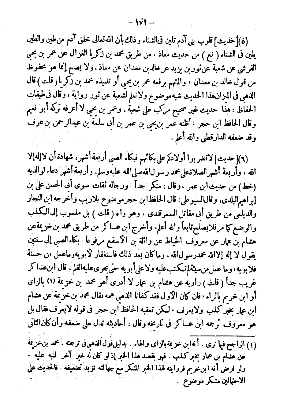 (6) [حَدِيثٌ] " لَا تَضْرِبُوا أَوْلادَكُمْ عَلَى بُكَائِهِمْ فَبُكَاءُ الصَّبِيِّ أَرْبَعَةَ أَشْهُرٍ، شَهَادَةُ أَنْ لَا إِلَهَ إِلا اللَّهُ، وَأَرْبَعَةَ أَشْهُرٍ الصَّلاةُ عَلَى مُحَمَّدٍ رَسُولِ الله، وَأَرْبَعَةَ أَشْهُرٍ دُعَاءٌ لِوَالِدَيْهِ " (خطّ) من حَدِيث ابْن عمر، وَقَالَ: مُنكر جدا وَرِجَاله ثِقَات سوى أبي الْحسن عَليّ بن إِبْرَاهِيم الْبَلَدِي، وَقَالَ السُّيُوطِيّ: قَالَ الْحَافِظ ابْن حجر مَوْضُوع بِلَا ريب وَأخرجه ابْن النجار والديلمي من طَرِيق أبي مقَاتل السَّمرقَنْدِي، وَهُوَ واه (قلت) بلَى مَنْسُوب إِلَى الْكَذِب والوضع كَمَا مر فَلَا يصلح تَابعا وَالله أعلم، وَأخرج ابْن عَسَاكِر من طَرِيق مُحَمَّد بن خُزَيْمَة عَن هِشَام بن عمار عَن مَعْرُوف الْخياط عَن وَاثِلَة بن الْأَسْقَع " مَرْفُوعا بكاء الصَّبِي إِلَى سنتَيْن يَقُول لَا إِلَه إِلَّا الله مُحَمَّد رَسُول الله، وَمَا كَانَ بعد ذَلِك فاستغفار لِأَبَوَيْهِ وَمَا عمل من حَسَنَة فَلَا بويه، وَمَا عمل من سَيِّئَة لم تكْتب عَلَيْهِ وَلَا على أَبَوَيْهِ حَتَّى يجْرِي عَلَيْهِ الْقَلَم، " قَالَ ابْن عَسَاكِر غَرِيب جدا (قلت) رَاوِيه عَن هِشَام بن عمار لَا أَدْرِي أهوَ مُحَمَّد بن خُزَيْمَة بالزاي أَو ابْن خريم بالراء، فَإِن كَانَ الأول فقد كفانا الذَّهَبِيّ همه فَقَالَ مُحَمَّد بن خُزَيْمَة عَن هِشَام ابْن عمار بِخَبَر كذب وَلَا يعرف، لَكِن تعقبه الْحَافِظ ابْن حجر فِي قَوْله لَا يعرف فَقَالَ بل هُوَ مَعْرُوف تَرْجمهُ ابْن عَسَاكِر فِي تَارِيخه وَقَالَ: أَحَادِيثه تدل على ضعفه وَإِن كَانَ الثانى