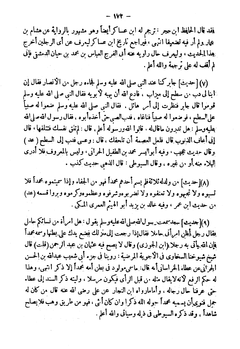 (9) [حَدِيثُ] " سَعْدٍ سَمِعْتُ رَسُولَ اللَّهِ يَقُولُ: هَلِ امْرَأَةٌ مِنْ نِسَائِكُمْ حَامِلٌ فَقَالَ رَجُلٌ أَظُنُّ امْرَأَتِي حَامِلا فَقَالَ إِذَا رَجَعْتُ إِلَى مَنْزِلِكَ فَضَعْ يَدَكَ عَلَى بَطْنِهَا وَسَمِّهِ مُحَمَّدًا فَإِنَّ اللَّهَ يَأْتِي بِهِ رَجُلا " (ابْن الْجَوْزِيّ) وَقَالَ لَا يَصح فِيهِ عُثْمَان بن عبد الرَّحْمَن (قلت) قَالَ شيخ شُيُوخنَا السخاوي فِي الْأَجْوِبَة المرضية: روينَا فِي جُزْء أبي شُعَيْب عبد الله بن الْحسن الْحَرَّانِي عَن عَطاء الْخُرَاسَانِي أَنه قَالَ: " مَا سمي مَوْلُود فِي بطن أمه مُحَمَّدًا إِلَّا ذكر انْتهى، وَهَذَا لَهُ حكم الرّفْع لِأَنَّهُ لَا يُقَال مثله من قبل الرَّأْي فَيكون مُرْسلا، وليته ذكر السَّنَد إِلَى عَطاء حَتَّى عرفنَا حَال رِجَاله، " وَأما مَا رَوَاهُ ابْن النجار عَن عَليّ رَضِي الله عَنهُ قَالَ: من كَانَ لَهُ حمل فَنوى أَن يُسَمِّيه مُحَمَّدًا حوله الله ذكرا وَإِن كَانَ أُنْثَى، فَهُوَ من طَرِيق وهب فَلَا يصلح شَاهدا، " وَقد ذكره السُّيُوطِيّ فِي ذيله وَسَيَأْتِي وَالله أعلم.