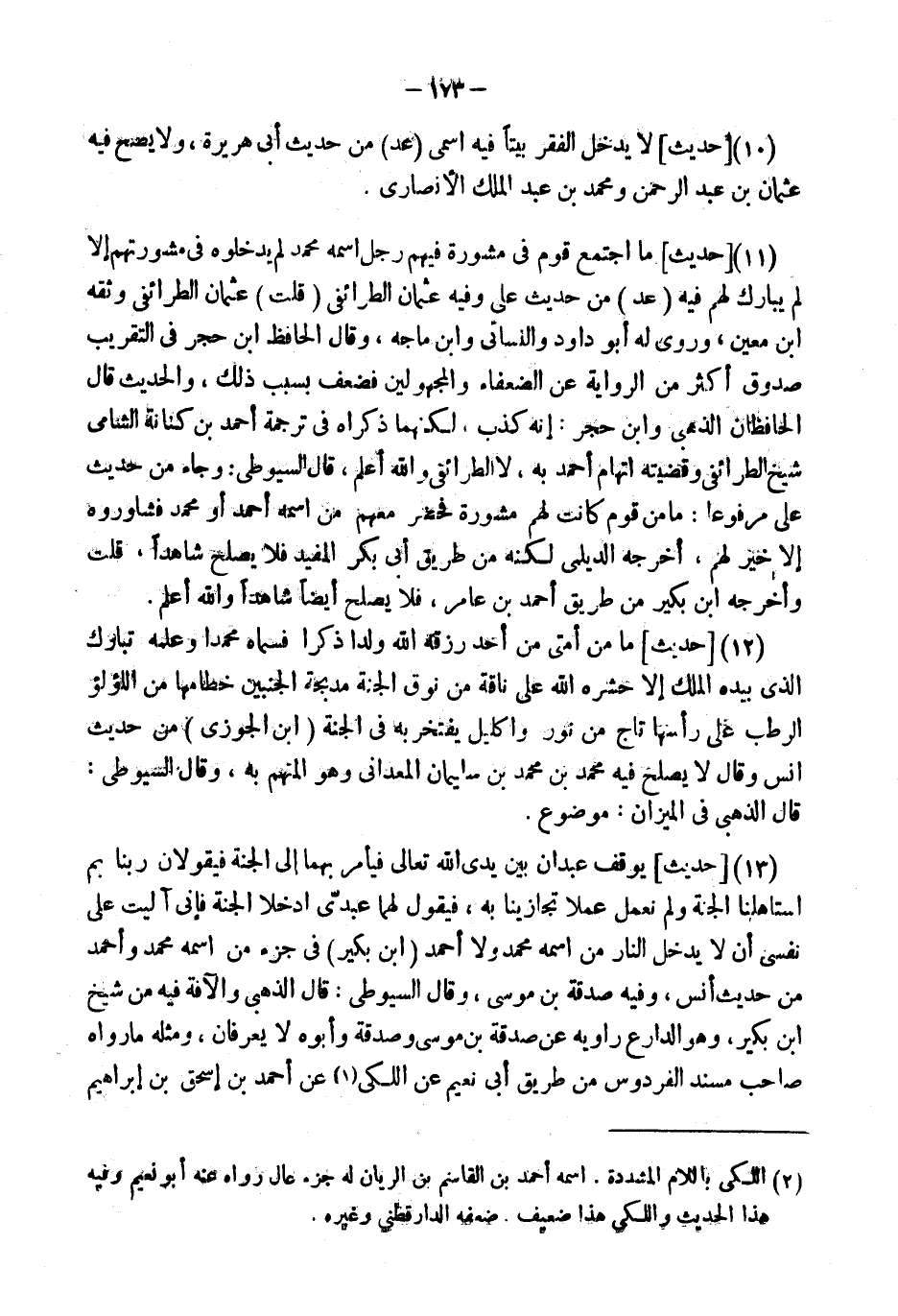 (12) [حَدِيثٌ] " مَا مِنْ أُمَّتِي مِنْ أَحَدٍ رَزَقَهُ اللَّهُ وَلَدًا ذَكَرًا فَسَمَّاهُ مُحَمَّدًا وَعَلَّمَهُ {تَبَارَكَ الذى بِيَدِهِ الْملك} إِلا حَشَرَهُ اللَّهُ عَلَى نَاقَةٍ مِنْ نُوقِ الْجَنَّةِ مُدَبَّجَةِ الْجَنْبَيْنِ خِطَامُهَا مِنَ اللُّؤْلُؤِ الرَّطِبِ عَلَى رَأْسِهَا تَاجٌ مِنْ نُورٍ وَإِكْلِيلٌ يُفْتَخَرُ بِهِ فِي الْجَنَّةِ " (ابْن الْجَوْزِيّ) من حَدِيث أنس وَقَالَ لَا يصلح فِيهِ مُحَمَّد بن مُحَمَّد بن سُلَيْمَان المعداني وَهُوَ الْمُتَّهم بِهِ، وَقَالَ السُّيُوطِيّ: قَالَ الذَّهَبِيّ فِي الْمِيزَان: مَوْضُوع [حَدِيثٌ] " يُوقَفُ عَبْدَانِ بَيْنَ يَدَيِ اللَّهِ تَعَالَى فَيَأْمُرُ بِهِمَا إِلَى الْجَنَّةِ فَيَقُولانِ رَبَّنَا بِمَ اسْتَأْهَلْنَا الْجَنَّةَ وَلَمْ نَعْمَلْ عَمَلا تُجَازِينَا بِهِ، فَيَقُولُ لَهُمَا عَبْدَيَّ ادْخُلا الْجَنَّةَ فَإِنِّي آلَيْتُ عَلَى نَفْسِي أَنْ لَا يَدْخُلَ النَّارَ مَنِ اسْمُهُ مُحَمَّدٌ وَلا أَحْمَدُ " (ابْن بكير) فِي جُزْء من اسْمه مُحَمَّد وَأحمد من حَدِيث أنس، وَفِيه صَدَقَة بن مُوسَى، وَقَالَ السُّيُوطِيّ: قَالَ الذَّهَبِيّ والآفة فِيهِ من شيخ ابْن بكير، وَهُوَ الدارع رَاوِيه عَن صَدَقَة بن مُوسَى وَصدقَة وَأَبوهُ لَا يعرفان، وَمثله مَا رَوَاهُ صَاحب مُسْند الفردوس من طَرِيق أبي نعيم عَن اللكي عَن أَحْمد بن إِسْحَق بن إِبْرَاهِيم