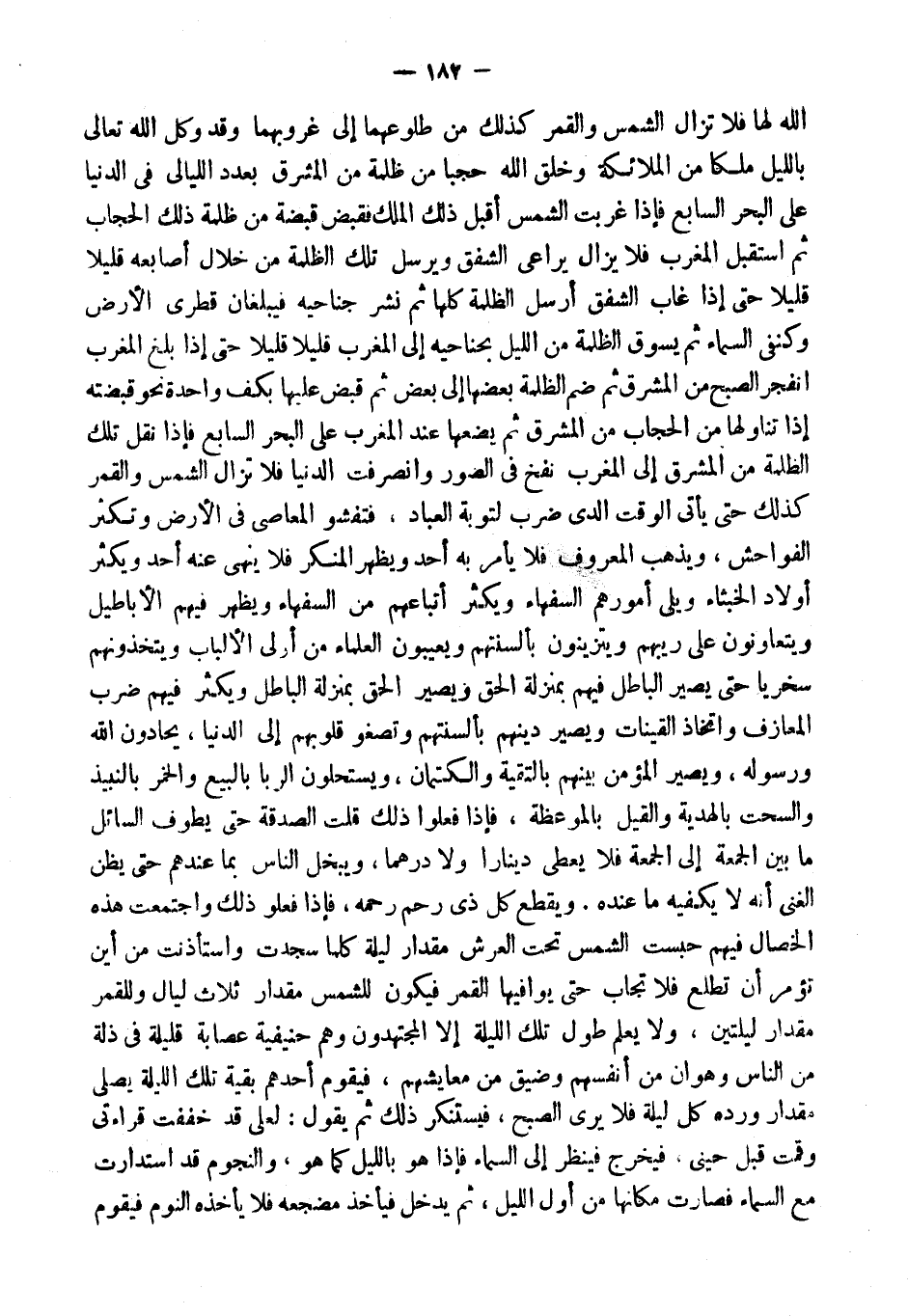 اللَّهُ لَهَا فَلا تَزَالُ الشَّمْسُ وَالْقَمَرُ كَذَلِكَ مِنْ طُلُوعِهِمَا إِلَى غُرُوبِهِمَا وَقَدْ وَكَّلَ اللَّهُ تَعَالَى بِاللَّيْلِ مَلَكًا مِنَ الْمَلائِكَةِ وَخَلَقَ اللَّهُ حُجُبًا مِنْ ظُلْمَةٍ مِنَ الْمَشْرِقِ بِعَدَدِ اللَّيَالِي فِي الدُّنْيَا عَلَى الْبَحْرِ السَّابِعِ فَإِذَا غَرَبَتِ الشَّمْسُ أَقْبَلَ ذَلِكَ الْمَلَكُ فَقَبَضَ قَبْضَةً مِنْ ظُلْمَةِ ذَلِكَ الْحِجَابِ ثُمَّ اسْتَقْبَلَ الْمَغْرِبَ فَلا يَزَالُ يُرَاعِي الشَّفَقَ وَيُرْسِلُ تِلْكَ الظُّلْمَةَ مِنْ خِلالِ أَصَابِعِهِ قَلِيلا قَلِيلا حَتَّى إِذَا غَابَ الشَّفَقُ أَرْسَلَ الظُّلْمَةَ كُلَّهَا ثُمَّ نَشَرَ جَنَاحَيْهِ فَيَبْلُغَانِ قُطْرَيِ الأَرْضِ وَكَنَفَيِ السَّمَاءِ ثمَّ يَسُوق الظلمَة فى اللَّيْلِ بِجَنَاحَيْهِ إِلَى الْمَغْرِبِ قَلِيلا قَلِيلا حَتَّى إِذَا بَلَغَ الْمَغْرِبَ انْفَجَرَ الصُّبْحُ مِنَ الْمَشْرِقِ ثُمَّ ضَمَّ الظُّلْمَةَ بَعْضَهَا إِلَى بَعْضٍ ثُمَّ قَبَضَ عَلَيْهَا بِكَفٍّ وَاحِدَةٍ نَحْوَ قَبْضَتِهِ إِذَا تَنَاوَلَهَا مِنَ الْحِجَابِ مِنَ الْمَشْرِقِ ثُمَّ يَضَعُهَا عِنْدَ الْمَغْرِبِ عَلَى الْبَحْرِ السَّابِعِ فَإِذَا نَقَلَ تِلْكَ الظُّلْمَةَ مِنَ الْمَشْرِقِ إِلَى الْمَغْرِبِ نُفِخَ فِي الصُّورِ وَانْصَرَفَتِ الدُّنْيَا فَلا تَزَالُ الشَّمْسُ وَالْقَمَرُ كَذَلِكَ حَتَّى يَأْتِيَ الْوَقْت الدى ضُرِبَ لِتَوْبَةِ الْعِبَادِ، فَتَفْشُو الْمَعَاصِي فِي الأَرْضِ وَتَكْثُرُ الْفَوَاحِشُ، وَيَذْهَبُ الْمَعْرُوفُ فَلا يَأْمُرُ بِهِ أَحَدٌ وَيَظْهَرُ الْمُنْكَرُ فَلا يَنْهَى عَنْهُ أَحَدٌ وَيَكْثُرُ أَوْلادُ الْخُبَثَاءِ وَيَلِي أُمُورَهُمُ السُّفَهَاءُ وَيَكْثُرُ أَتْبَاعُهُمْ مِنَ السُّفَهَاءِ وَيَظْهَرُ فِيهِمُ الأَبَاطِيلُ وَيَتَعَاوَنُونَ عَلَى رَيْبِهِمْ وَيَتَزَيَّنُونَ بِأَلْسِنَتِهِمْ وَيَعِيبُونَ الْعُلَمَاءَ مِنْ أُولِي الأَلْبَابِ وَيَتَّخِذُونَهُمْ سِخْرِيًّا حَتَّى يَصِيرَ الْبَاطِلُ فِيهِمْ بِمَنْزِلَةِ الْحَقِّ وَيَصِيرَ الْحَقُّ بِمَنْزِلَةِ الْبَاطِلِ وَيَكْثُرُ فِيهِمْ ضَرْبُ الْمَعَازِفِ وَاتِّخَاذُ الْقَيْنَاتِ وَيَصِيرُ دِينُهُمْ بِأَلْسِنَتِهِمْ وَتَصْغُو قُلُوبُهُمْ إِلَى الدُّنْيَا، يُحَادُّونَ اللَّهَ وَرَسُولَهُ، وَيَصِيرُ الْمُؤْمِنُ بَيْنَهُمْ بِالتَّقِيَّةِ وَالْكِتْمَانِ، وَيَسْتَحِلُّونَ الرِّبَا بِالْبَيْعِ وَالْخَمْرَ بِالنَّبِيذِ وَالسُّحْتَ بِالْهَدِيَّةِ وَالْقِيلَ بِالْمَوْعِظَةِ، فَإِذَا فَعَلُوا ذَلِكَ قَلَّتِ الصَّدَقَةُ حَتَّى يَطُوفَ السَّائِلُ مَا بَيْنَ الْجُمُعَةِ إِلَى الْجُمُعَةِ فَلا يُعْطَى دِينَارًا وَلا دِرْهَمًا، وَيَبْخَلُ النَّاسُ بِمَا عِنْدَهُمْ حَتَّى يَظُنَّ الْغَنِيُّ أَنَّهُ لَا يَكْفِيهِ مَا عِنْدَهُ. وَيَقْطَعُ كُلُّ ذِي رَحِمٍ رَحِمَهُ، فَإِذَا فَعَلُوا ذَلِكَ وَاجْتَمَعَتْ هَذِهِ الْخِصَالُ فِيهِمْ حُبِسَتِ الشَّمْسُ تَحْتَ الْعَرْشِ مِقْدَارَ لَيْلَةٍ كُلَّمَا سَجَدَتْ وَاسْتَأْذَنَتْ مِنْ أَيْنَ تُؤْمَرُ أَنْ تَطْلُعَ فَلا تُجَابُ حَتَّى يُوَافِيَهَا الْقَمَرُ فَيَكُونُ لِلشَّمْسِ مِقْدَارَ ثَلاثِ لَيَالٍ وَلِلْقَمَرِ مِقْدَارَ لَيْلَتَيْنِ، وَلا يَعْلَمُ طُولَ تِلْكَ اللَّيْلَةِ إِلا الْمُجْتَهِدُونَ وَهُمْ حَنِيفِيَّةٌ عِصَابَةٌ قَلِيلَةٌ فِي ذِلَّةٍ مِنَ النَّاسِ وَهَوَانٍ مِنْ أَنْفُسِهِمْ وَضِيقٍ مِنْ مَعَايِشِهِمْ، فَيَقُومُ أَحَدُهُمْ بَقِيَّةَ تِلْكَ اللَّيْلَةِ يُصَلِّي مِقْدَارَ وِرْدِهِ كُلَّ لَيْلَةٍ فَلا يَرَى الصُّبْحَ، فَيَسْتَنْكِرُ ذَلِكَ ثُمَّ يَقُولُ: لَعَلِّي قَدْ خَفَّفْتُ قِرَاءَتِي وَقُمْتُ قَبْلَ حِينِي، فَيَخْرُجُ فَيَنْظُرُ إِلَى 