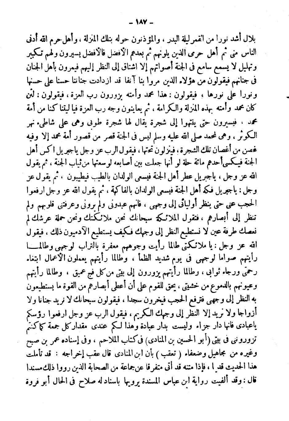 بِلالٍ أَشَدُّ نُورًا مِنَ الْقَمَرِ لَيْلَةَ الْبَدْرِ، وَالْمُؤَذِّنُونَ حَوْلَهُ بِتِلْكَ الْمَنْزِلَةِ، وَأَهْلُ حَرَمِ اللَّهِ أَدْنَى النَّاسِ مِنِّي ثُمَّ أَهْلُ حَرَمِي الَّذِينَ يَلُونَهُمْ ثُمَّ بَعْدَهُمُ الأَفْضَلُ فَالأَفْضَلِ يَسِيرُونَ وَلَهُمْ تَكْبِيرٌ وَتَهْلِيلٌ لَا يَسْمَعُ سَامِعٌ فِي الْجَنَّةِ أَصْوَاتَهُمْ إِلا اشْتَاقَ إِلَى النَّظَرِ إِلَيْهِمْ فَيَمُرُّونَ بِأَهْلِ الْجِنَانِ فِي جِنَانِهِمْ فَيَقُولُونَ مَنْ هَؤُلاءِ الَّذِينَ مَرُّوا بِنَا آنِفًا قَدِ ازْدَادَتْ جِنَانُنَا حُسْنًا عَلَى حُسْنِهَا وَنُورًا عَلَى نُورِهَا، فَيَقُولُونَ: هَذَا مُحَمَّدٌ وَأُمَّتُهُ يَزُورُونَ رَبَّ الْعِزَّةِ، فَيَقُولُونَ: لَئِنْ كَانَ مُحَمَّدٌ وَأُمَّتُهُ بِهَذِهِ الْمَنْزِلَةِ وَالْكَرَامَةِ، ثُمَّ يُعَايِنُونَ وَجْهَ رَبِّ الْعِزَّةِ فَيَا لَيْتَنَا كُنَّا مِنْ أُمَّةِ مُحَمَّدٍ، فَيَسِيرُونَ حَتَّى يَنْتَهُوا إِلَى شَجَرَةٍ يُقَالُ لَهَا شَجَرَةُ طُوبَى وَهِيَ عَلَى شَاطِئِ نهر الْكَوْثَر، وهى لمُحَمد لَيْسَ فِي الْجَنَّةِ قَصْرٌ مِنْ قُصُورِ أُمَّةِ مُحَمَّدٍ إِلا وَفِيهِ غُصْنٌ مِنْ أَغْصَانِ تِلْكَ الشَّجَرَةِ، فَيَنْزِلُونَ تَحْتَهَا، فَيَقُولُ الرَّبُّ عَزَّ وَجَلَّ يَا جِبْرِيلُ اكْسُ أَهْلَ الْجَنَّةِ فَيُكْسَى أَحَدُهُمْ مِائَةَ حُلَّةٍ لَوْ أَنَّهَا جُعِلَتْ بَيْنَ أَصَابِعِهِ لَوَسِعَتْهَا مِنْ ثِيَابِ الْجَنَّةِ، ثُمَّ يَقُولُ اللَّهُ عَزَّ وَجَلَّ، يَا جِبْرِيلُ عَطِّرْ أَهْلَ الْجَنَّةِ فَيَسْعَى الْوِلْدَانُ بِالطِّيبِ فَيُطَيَّبُونَ، ثُمَّ يَقُولُ عَزَّ وَجَلَّ: يَا جِبْرِيلُ فَكِّهْ أَهْلَ الْجَنَّةِ فَيَسْعَى الْوِلْدَانُ بِالْفَاكِهَةِ، ثُمَّ يَقُولُ اللَّهُ عَزَّ وَجَلَّ ارْفَعُوا الْحُجُبَ عَنِّي حَتَّى يَنْظُرَ أَوْلِيَائِي إِلَى وَجْهِي، فَإِنَّهُمْ عَبَدُونِي وَلَمْ يَرَوْنِي وَعَرَفَتْنِي قُلُوبُهُمْ وَلَمْ تَنْظُرْ إِلَيَّ أَبْصَارُهُمْ، فَتَقُولُ الْمَلائِكَةُ سُبْحَانَكَ نَحْنُ مَلائِكَتُكَ وَنَحْنُ حَمَلَةُ عَرْشِكَ لَمْ نَعْصِكَ طَرْفَةَ عَيْنٍ لَا نَسْتَطِيعُ النَّظَرَ إِلَى وَجْهِكَ فَكَيْفَ يَسْتَطِيعُ الآدَمِيُّونَ ذَلِكَ، فَيَقُولُ اللَّهُ عَزَّ وَجَلَّ: يَا مَلائِكَتِي طَالَمَا رَأَيْتُ وُجُوهَهُمْ مُعَفَّرَةً بِالتُّرَابِ لِوَجْهِي وَطَالَمَا رَأَيْتُهُمْ صُوَّامًا لِوَجْهِي فِي يَوْمٍ شَدِيدِ الظَّمَإِ، وَطَالَمَا رَأَيْتُهُمْ يَعْمَلُونَ الأَعْمَالَ ابْتِغَاءَ رَحْمَتِي وَرَجَاءَ ثَوَابِي، وَطَالَمَا رَأَيْتُهُمْ يَزُورُونَ إِلَى بَيْتِي مِنْ كُلِّ فَجٍّ عميق، وطالما رَأَيْتهمْ وعيونهم بِالدُّمُوعِ مِنْ خَشْيَتِي، يَحِقُّ لِلْقَوْمِ عَلَيَّ أَنْ أُعْطِيَ أَبْصَارَهُمْ مِنَ الْقُوَّةِ مَا يَسْتَطِيعُونَ بِهِ النَّظَرَ إِلَى وَجْهِي فَتُرْفَعُ الْحُجُبُ فَيَخِرُّونَ سُجَّدًا، فَيَقُولُونَ سُبْحَانَكَ لَا نُرِيدُ جِنَانًا وَلا أَزْوَاجًا وَلا نُرِيدُ إِلا النَّظَرَ إِلَى وَجْهِكَ الْكَرِيمِ، فَيَقُولُ الرَّبُّ عَزَّ وَجَلَّ ارْفَعُوا رؤسكم يَا عِبَادِي فَإِنَّهَا دَارُ جَزَاءٍ وَلَيْسَتْ بِدَارِ عِبَادَةٍ وَهَذَا لَكُمْ عِنْدِي مِقْدَارُ كُلِّ جُمُعَةٍ كَمَا كُنْتُمْ تَزُورُونَنِي فِي بَيْتِي (أَبُو الْحُسَيْن بن الْمُنَادِي) فِي كتاب الْمَلَاحِم، وَفِي إِسْنَاده عمر بن صبح وَغَيره من مَجَاهِيل وضعفاء (تعقب) بِأَن ابْن الْمُنَادِي قَالَ عقب إِخْرَاجه: قد تَأَمَّلت هَذَا الحَدِيث قَدِيما، فَإِذا مَتنه قد أَتَى مُتَفَرقًا عَن جمَاعَة من الصَّحَابَة الَّذين رووا ذَلِك مُسْندًا قَالَ: وَقد ألفيت رِوَايَة ابْن عَبَّاس المسندة يَرْوِيهَا بِإِسْنَاد لَهُ صَلَاح فِي الْحَال أَبُو فَرْوَة