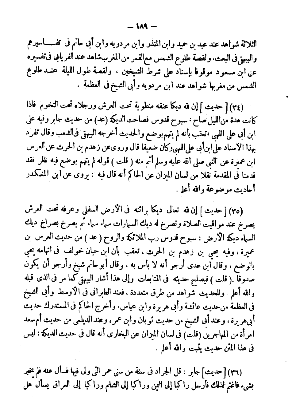 (35) [حَدِيثٌ] " إِنَّ لِلَّهِ تَعَالَى دِيكًا بَرَاثِنُهُ فِي الأَرْضِ السُّفْلَى وَعُرْفُهُ تَحْتَ الْعَرْشِ يَصْرُخُ عِنْدَ مَوَاقِيتِ الصَّلَاة وتصرخ لَهُ ديك السَّمَاوَات سَمَاءً سَمَاءً ثُمَّ يَصْرُخُ بِصُرَاخِ دِيكِ السَّمَاءِ دِيكَةُ الأَرْضِ: سُبُّوحٌ قُدُّوسٌ رَبُّ الْمَلائِكَةِ وَالرُّوحِ " (عد) من حَدِيث الْعرس بن عميرَة، وَفِيه يحيى بن زَهْدَم بن الْحَرْث، تعقب بِأَن ابْن حبَان خُولِفَ فِي اتهامه يحيى بِالْوَضْعِ، وَقَالَ ابْنُ عَدِيٍّ أرَجْو أَنَّهُ لَا بَأْس بِهِ، وَقَالَ أَبُو حَاتِم شيخ وَأَرْجُو أَن يكون صَدُوقًا. (قلت) فيصلح حَدِيثه فِي المتابعات وَإِلَى هَذَا أَشَارَ الْبَيْهَقِيّ كَمَا مر فِي الَّذِي قبله وَالله أعلم وَلِلْحَدِيثِ شَوَاهِد من طرق مُتعَدِّدَة، فَعِنْدَ الطَّبَرَانِيّ فِي الْأَوْسَط وَأبي الشَّيْخ فِي العظمة من حَدِيث عَائِشَة وَأبي هُرَيْرَة وَابْن عَبَّاس، وَأخرج الْحَاكِم فِي الْمُسْتَدْرك حَدِيث أبي هُرَيْرَة، وَعند أبي الشَّيْخ من حَدِيث ثَوْبَان وَابْن عمر، وَعند الديلمي من حَدِيث أم سعد امْرَأَة من الْمُهَاجِرين (قلت) فِي لِسَان الْمِيزَان عَن البُخَارِيّ أَنه قَالَ فِي حَدِيث الديكة: لَيْسَ فِي هَذَا الْمَتْن حَدِيث يثبت وَالله أعلم.