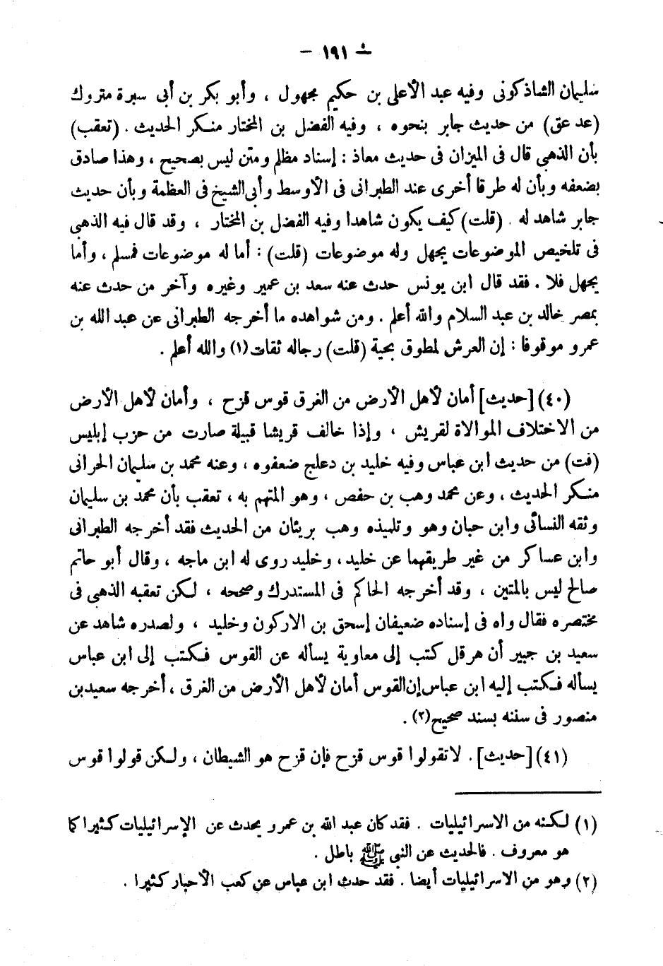 (40) [حَدِيثٌ] " أَمَانٌ لأَهْلِ الأَرْضِ مِنَ الْغَرَقِ قَوْسُ قُزَحَ، وَأَمَانٌ لأَهْلِ الأَرْضِ مِنَ الاخْتِلافِ الْمُوَالاةُ لِقُرَيْشٍ، وَإِذَا خَالَفَ قُرَيْشًا قَبِيلَةٌ صَارَتْ مِنْ حِزْبِ إِبْلِيسَ " (فت) من حَدِيث ابْن عَبَّاس وَفِيه خُلَيْد بن دعْلج ضَعَّفُوهُ، وَعنهُ مُحَمَّد بن سُلَيْمَان الْحَرَّانِي مُنكر الحَدِيث، وَعَن مُحَمَّد وهب بن حَفْص، وَهُوَ الْمُتَّهم بِهِ، تعقب بِأَن مُحَمَّد بن سُلَيْمَان وَثَّقَهُ النَّسَائِيّ وَابْن حبَان وَهُوَ وتلميذه وهب بريئان من الحَدِيث فقد أخرجه الطَّبَرَانِيّ وَابْن عَسَاكِر من غير طريقهما عَن خُلَيْد، وخليد روى لَهُ ابْن مَاجَه، وَقَالَ أَبُو حَاتِم صَالح لَيْسَ بالمتين، وَقد أخرجه الْحَاكِم فِي الْمُسْتَدْرك وَصَححهُ، لَكِن تعقبه الذَّهَبِيّ فِي مُخْتَصره فَقَالَ واه فِي إِسْنَاده ضعيفان إِسْحَق بن الأركون وخليد، ولصدره شَاهد عَن سعيد بن جُبَير أَن هِرقل كتب إِلَى مُعَاوِيَة يسْأَله عَن الْقوس فَكتب إِلَى ابْن عَبَّاس يسْأَله فَكتب إِلَيْهِ ابْن عَبَّاس إِن الْقوس أَمَان لأهل الأَرْض من الْغَرق، أخرجه سعيد بن مَنْصُور فِي سنَنه بِسَنَد صَحِيح.