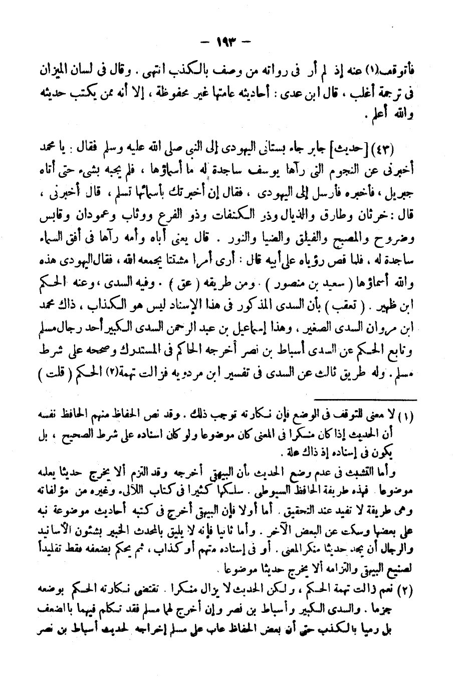 (43) [حَدِيثُ] " جَابِرٍ جَاءَ بستانى اليهودى إِلَى النبى فَقَالَ: يَا مُحَمَّدُ أَخْبِرْنِي عَنِ النُّجُومِ الَّتِي رَآهَا يُوسُفُ سَاجِدَةً لَهُ مَا أَسْمَاؤُهَا، فَلَمْ يُجِبْهُ بشئ حَتَّى أَتَاهُ جِبْرِيلُ، فَأَخْبَرَهُ فَأَرْسَلَ إِلَى الْيَهُودِيِّ، فَقَالَ إِنْ أَخْبَرْتُكَ بِأَسْمَائِهَا تُسْلِمُ، قَالَ أَخْبِرْنِي، قَالَ: خرثَانُ وَطَارِقٌ وَالذَّيَّالُ وَذُو الْكَنَفَاتِ وَذُو الْفَرْعِ وَوَثَّابٌ وَعَمُودَانِ وَقَابِسٌ وَضُروُحٌ وَالْمُصَبِّحُ وَالْفَيْلَقُ وَالضِّيَا وَالنُّورُ. قَالَ يَعْنِي أَبَاهُ وَأُمَّهُ رَآهَا فِي أُفُقِ السَّمَاءِ سَاجِدَةً لَهُ، فَلَمَّا قَصَّ رُؤْيَاهُ عَلَى أَبِيهِ قَالَ: أَرَى أَمْرًا مُشَتَّتًا يَجْمَعُهُ اللَّهُ، فَقَالَ الْيَهُودِيُّ هَذِهِ وَاللَّهِ أَسْمَاؤُهَا (سعيد بن مَنْصُور) ". وَمن طَرِيقه (عق) . وَفِيه السّديّ، وَعنهُ الحكم ابْن ظهير. (تعقب) بِأَن السّديّ الْمَذْكُور فِي هَذَا الْإِسْنَاد لَيْسَ هُوَ الْكذَّاب، ذَاك مُحَمَّد ابْن مَرْوَان السّديّ الصَّغِير، وَهَذَا إِسْمَاعِيل بن عبد الرَّحْمَن السّديّ الْكَبِير أحد رجال مُسلم وتابع الحكم عَن السّديّ أَسْبَاط بن نصر أخرجه الْحَاكِم فِي الْمُسْتَدْرك وَصَححهُ على شَرط مُسلم. وَله طَرِيق ثَالِث عَن السّديّ فِي تَفْسِير ابْن مرْدَوَيْه فَزَالَتْ تُهْمَة الحكم (قلت)