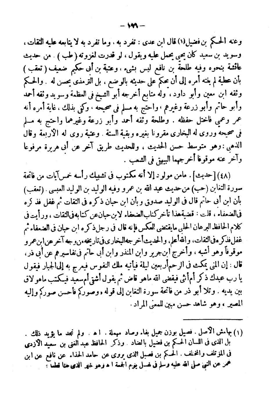 وَعنهُ الحكم بن فُضَيْل قَالَ ابْن عدي: تفرد بِهِ، وَمَا تفرد بِهِ لَا يُتَابِعه عَلَيْهِ الثِّقَات، وسُويد بن سعيد كَانَ يحيى يحمل عَلَيْهِ وَيَقُول، لَو قدرت لغزوته (طب) من حَدِيث عَائِشَة بِنَحْوِهِ وَفِيه طَلْحَة بن نَافِع لَيْسَ بشئ، وَعتبَة بن أبي حَكِيم ضَعِيف (تعقب) بِأَن عَطِيَّة لم ينْتَه أَمْرُهُ إِلَى أَنْ يُحْكَمَ عَلَى حَدِيثه بِالْوَضْعِ، بل التِّرْمِذِيّ يحسن لَهُ. وَالْحكم وَثَّقَهُ ابْن معِين وَأَبُو دَاوُد، وَله متابع أخرجه أَبُو الشَّيْخ فِي العظمة وسُويد وَثَّقَهُ أَحْمد وَأَبُو حَاتِم وَأَبُو زرْعَة وَغَيرهم، وَاحْتج بِهِ مُسلم فِي صَحِيحه، وَكفى بذلك، غَايَة أمره أَنه عمر وَعمي فاختل حفظه. وَطَلْحَة وَثَّقَهُ أَحْمد وَأَبُو زرْعَة وَغَيرهمَا وَاحْتج بِهِ مُسلم فِي صَحِيحه وروى لَهُ البُخَارِيّ مَقْرُونا بِغَيْرِهِ وَبَقِيَّة السِّتَّة. وَعتبَة روى لَهُ الْأَرْبَعَة وَقَالَ الذَّهَبِيّ: وَهُوَ متوسط حسن الحَدِيث، وَلِلْحَدِيثِ طَرِيق آخر عَن أبي هُرَيْرَة مَرْفُوعا وَآخر عَنهُ مَوْقُوفا أخرجهُمَا الْبَيْهَقِيّ فِي الشّعب.