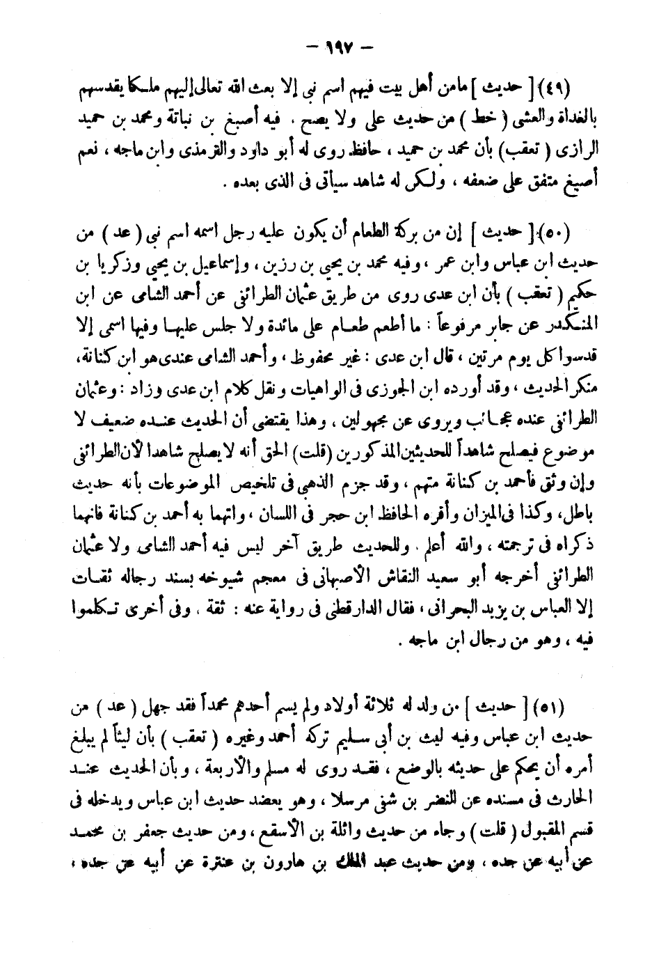 (51) [حَدِيثٌ] " مَنْ وُلِدَ لَهُ ثَلاثَةُ أَوْلادٍ وَلَمْ يُسَمِّ أَحَدَهُمْ مُحَمَّدًا فَقَدْ جَهِلَ " (عد) من حَدِيث ابْن عَبَّاس وَفِيهِ لَيْثُ بْنُ أَبِي سُلَيْمٍ تَركه أَحْمد وَغَيره (تعقب) بِأَن ليثا لم يبلغ أمره أَن يحكم على حَدِيثه بِالْوَضْعِ، فقد روى لَهُ مُسلم وَالْأَرْبَعَة، وَبِأَن الحَدِيث عِنْد الْحَارِث فِي مُسْنده عَن النَّضر بن شفي مُرْسلا، وَهُوَ يعضد حَدِيث ابْن عَبَّاس ويدخله فِي قسم المقبول (قلت) وَجَاء من حَدِيث وَاثِلَة بن الْأَسْقَع، وَمن حَدِيث جَعْفَر بن مُحَمَّد عَن أَبِيه عَن جده، وَمن حَدِيث عبد الْملك بن هَارُون بن عنزة عَن أَبِيه عَن جده،