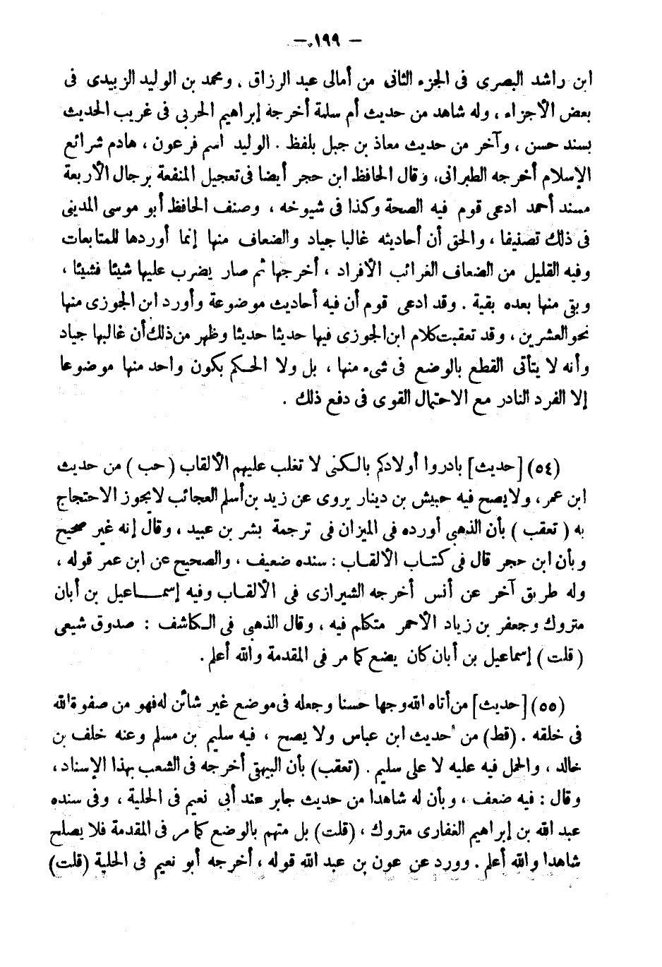 (54) [حَدِيثٌ] " بَادِرُوا أَوْلادَكُمْ بِالْكُنَى لَا تَغْلِبُ عَلَيْهِمُ الأَلْقَابُ " (حب) من حَدِيث ابْن عمر وَلَا يَصح فِيهِ حُبَيْش بن دِينَار يروي عَن زيد بن أسلم الْعَجَائِب لَا يجوز الِاحْتِجَاج بِهِ (تعقب) بِأَن الذَّهَبِيّ أوردهُ فِي الْمِيزَان فِي تَرْجَمَة بشر بن عبيد، وَقَالَ إِنَّه غير صَحِيح وَبِأَن ابْن حجر قَالَ فِي كتاب الألقاب: سَنَده ضَعِيف، وَالصَّحِيح عَن ابْن عمر قَوْله، وَله طَرِيق آخر عَن أنس أَخْرَجَهُ الشِّيرَازِيُّ فِي الأَلْقَابِ وَفِيهِ إِسْمَاعِيل بن أبان مَتْرُوك وجعفر بن زِيَاد الْأَحْمَر مُتَكَلم فِيهِ، وَقَالَ الذَّهَبِيّ فِي الكاشف: صَدُوق شيعي (قلت) إِسْمَاعِيل بن أبان كَانَ يضع كَمَا مر فِي الْمُقدمَة وَالله أعلم.