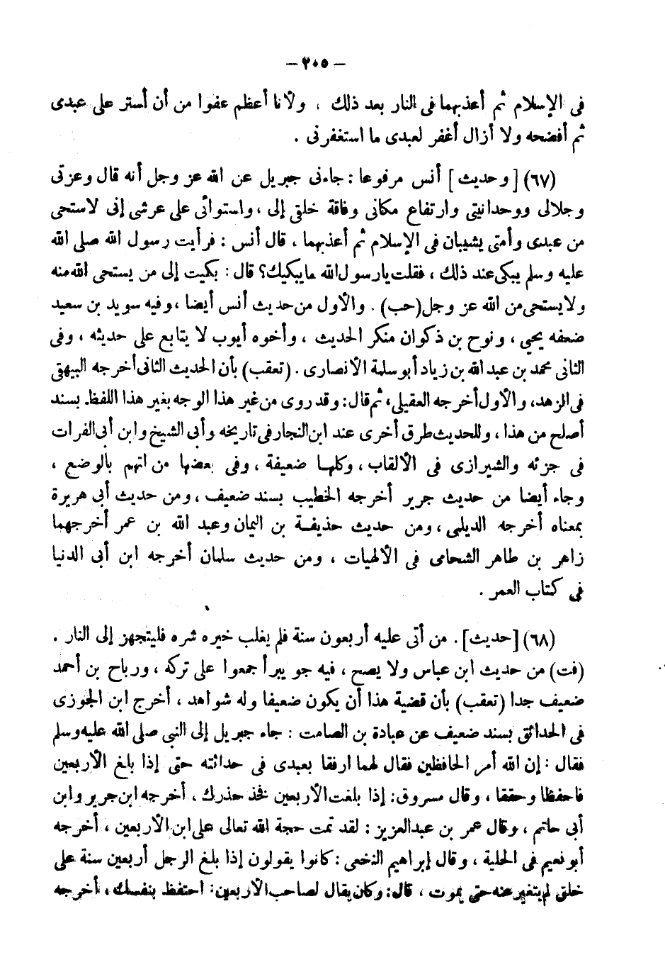(67) [وَحَدِيثُ] أَنَسٍ مَرْفُوعًا: " جَاءَنِي جِبْرِيلُ عَنِ اللَّهِ عَزَّ وَجَلَّ أَنَّهُ قَالَ وَعِزَّتِي وَجَلالِي وَوَحْدَانِيَّتِي وَارْتِفَاعِ مكانى وَالله وَفَاقَةِ خَلْقِي إِلَيَّ، وَاسْتِوَائِي عَلَى عَرْشِي إنِّي لأَسْتَحِي مِنْ عَبْدِي وَأَمَتِي يَشِيبَانِ فِي الإِسْلامِ ثُمَّ أُعَذْبِهُمَا، قَالَ أَنَسٌ: فَرَأَيْتُ رَسُولَ الله يَبْكِي عِنْدَ ذَلِكَ، فَقُلْتُ يَا رَسُولَ اللَّهِ مَا يُبْكِيكَ؟ قَالَ: بَكَيْتُ إِلَى مَنْ يَسْتَحِي اللَّهُ مِنْهُ وَلا يَسْتَحِي مِنَ اللَّهِ عَزَّ وَجَلَّ " (حب) . وَالْأول من حَدِيث أنس أَيْضا، وَفِيه سُوَيْد بن سعيد ضعفه يحيى، ونوح بن ذكْوَان مُنكر الحَدِيث، وَأَخُوهُ أَيُّوب لَا يُتَابع على حَدِيثه، وَفِي الثَّانِي مُحَمَّد بن عبد الله بن زِيَاد أَبُو سَلمَة الْأنْصَارِيّ. (تعقب) بِأَن الحَدِيث الثَّانِي أخرجه الْبَيْهَقِيّ فِي الزّهْد، وَالْأول أخرجه الْعقيلِيّ، ثمَّ قَالَ: وَقد روى من غير هَذَا الْوَجْه بِغَيْر هَذَا اللَّفْظ بِسَنَد أصلح من هَذَا، وَلِلْحَدِيثِ طرق أُخْرَى عِنْد ابْن النجار فِي تَارِيخه وَأبي الشَّيْخ وَابْن أبي الْفُرَات فِي جزئه والشيرازي فِي الألقاب، وَكلهَا ضَعِيفَة، وَفِي بَعْضهَا من اتهمَ بِالْوَضْعِ، وَجَاء أَيْضا من حَدِيث جرير أخرجه الْخَطِيب بِسَنَد ضَعِيف، وَمن حَدِيث أبي هُرَيْرَة بِمَعْنَاهُ أخرجه الديلمي، وَمن حَدِيث حُذَيْفَة بن الْيَمَان وَعبد الله بن عمر أخرجهُمَا زَاهِر بن طَاهِر الشحامي فِي الإلهيات، وَمن حَدِيث سلمَان أخرجه ابْن أبي الدُّنْيَا فِي كتاب الْعُمر.