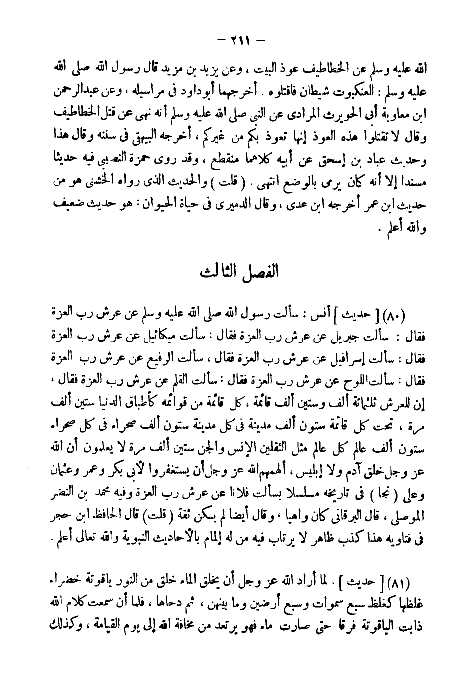 (80) [حَدِيثُ] أَنَسٍ: " سَأَلْتُ رَسُول الله عَنْ عَرْشِ رَبِّ الْعِزَّةِ فَقَالَ: سَأَلْتُ جِبْرِيلَ عَنْ عَرْشِ رَبِّ الْعِزَّةِ فَقَالَ: سَأَلْتُ مِيكَائِيلَ عَنْ عَرْشِ رَبِّ الْعِزَّةِ فَقَالَ: سَأَلْتُ إِسْرَافِيلَ عَنْ عَرْشِ رَبِّ الْعِزَّةِ فَقَالَ، سَأَلْتُ الرَّفِيعَ عَنْ عَرْشِ رَبِّ الْعِزَّةِ فَقَالَ: سَأَلْتُ اللَّوْحَ عَنْ عَرْشِ رَبِّ الْعِزَّةِ فَقَالَ: سَأَلْتُ الْقَلَمَ عَنْ عَرْشِ رَبِّ الْعِزَّة فَقَالَ، إِن للعرش ثلثمِائة أَلْفٍ وَسِتِّينَ أَلْفِ قَائِمَةٍ، كُلُّ قَائِمَةٍ مِنْ قَوَائِمِهِ كَأَطْبَاقِ الدُّنْيَا سِتِّينَ أَلْفِ مَرَّةٍ، تَحْتَ كُلِّ قَائِمَةٍ سِتُّونَ أَلْفَ مَدِينَةٍ فِي كُلِّ مَدِينَةٍ سِتُّونَ أَلْفَ صَحْرَاءَ فِي كُلِّ صَحْرَاءَ سِتُّونَ أَلْفَ عَالَمٍ كُلُّ عَالَمٍ مِثْلُ الثَّقَلَيْنِ الإِنْسِ وَالْجِنِّ سِتِّينَ أَلْفِ مَرَّةٍ لَا يَعْلَمُونَ أَنَّ اللَّهَ عَزَّ وَجَلَّ خَلَقَ آدَمَ وَلا إِبْلِيسَ، أَلْهَمَهُمُ اللَّهُ عَزَّ وَجَلَّ أَنْ يَسْتَغْفِرُوا لأَبِي بَكْرٍ وَعُمَرَ وَعُثْمَانَ وَعَلِيٍّ " (نجا) فِي تَارِيخه مسلسلا بسألت فلَانا عَن عرش رب الْعِزَّة وَفِيه مُحَمَّد بن النَّضر الْموصِلِي، قَالَ البرقاني كَانَ واهيا، وَقَالَ أَيْضا لم يكن ثِقَة (قُلْتُ) قَالَ الْحَافِظُ ابْنُ حَجَرٍ فِي فَتَاوِيهِ هَذَا كذب ظَاهر لَا يرتاب فِيهِ من لَهُ إِلْمَام بالأحاديث النَّبَوِيَّة وَالله تَعَالَى أعلم.