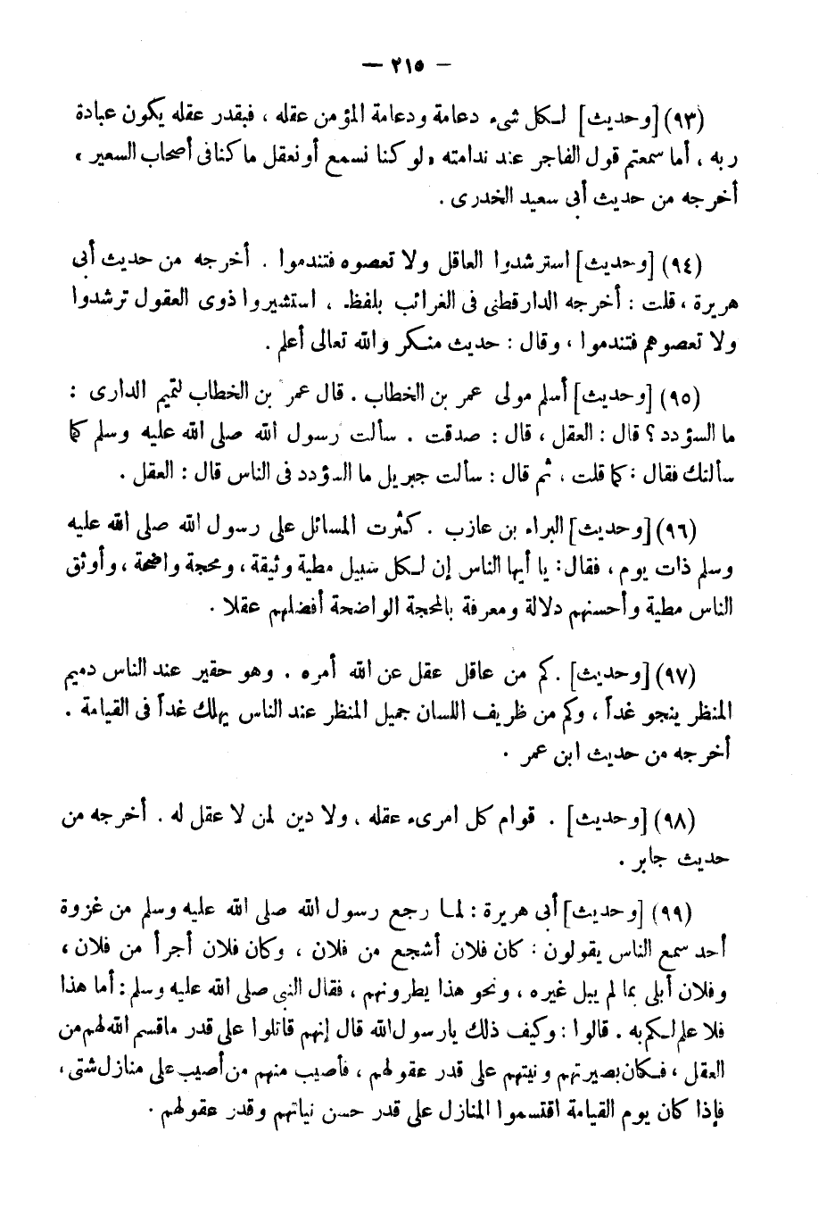 (93) [وَحَدِيث] " لكل شئ دِعَامَةٌ وَدِعَامَةُ الْمُؤْمِنِ عَقْلُهُ، فَبِقَدْرِ عَقْلِهِ يَكُونُ عِبَادَةُ رَبِّهِ، أَمَا سَمِعْتُمْ قَوْلَ الْفَاجِرِ عِنْدَ نَدَامَتِهِ، {لَوْ كُنَّا نَسْمَعُ أَوْ نَعْقِلُ مَا كُنَّا فِي أَصْحَابِ السَّعِيرِ} أخرجه من حَدِيث أبي سعيد الْخُدْرِيّ.