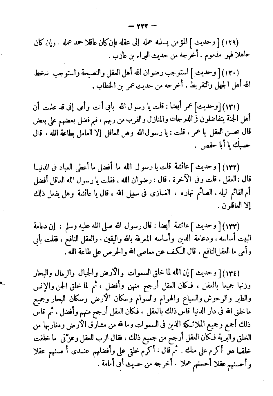 (134) [وَحَدِيثٌ] " إِنَّ اللَّهَ لَمَّا خَلَقَ السَّمَوَاتِ وَالأَرْضَ وَالْجِبَالَ وَالرِّمَالَ وَالْبِحَارَ وَزَنَهَا جَمِيعًا بِالْعَقْلِ، قكان الْعَقْلُ أَرْجَحَ مِنْهُنَّ وَأَفْضَلَ، ثُمَّ لَمَّا خَلَقَ الْجِنَّ وَالإِنْسَ وَالطَّيْرَ وَالْوُحُوشَ وَالسِّبَاعَ وَالْهَوَامَّ وَسُكَّانَ الأَرْضِ وَسُكَّانَ الْبِحَارِ وَجَمِيعَ مَا خَلَقَ اللَّهُ فِي دَارِ الدُّنْيَا قَاسَ ذَلِكَ بِالْعَقْلِ، فَكَانَ الْعَقْلُ أَرْجَحَ مِنْهُمْ وَأَفْضَلَ، ثُمَّ قَاسَ ذَلِكَ أَجْمَعَ وَجَمِيعَ الْمَلائِكَةِ الَّذِينَ فِي السَّمَوَاتِ وَمَا لِلَّهِ مِنْ مَشَارِقِ الأَرْضِ وَمَغَارِبِهَا مِنَ الْخَلْقِ وَالْبَرِيَّةِ فَكَانَ الْعَقْلُ أَرْجَحَ مِنْ جَمِيعِ ذَلِكَ، فَقَالَ الرَّبُّ لِلْعَقْلِ وَعِزَّتِي مَا خَلَقْتُ خَلْقًا هُوَ أَكْرَمُ عَلَيَّ مِنْكَ. ثُمَّ قَالَ: أَكْرَمُ خَلْقِي عَلَيَّ وَأَفْضَلُهُمْ عِنْدِي أَحْسَنُهُمْ عَقْلا وَأَحْسَنُهُمْ عَقْلا أَحْسَنُهُمْ عَمَلا ". أخرجه من حَدِيث أبي أُمَامَة.