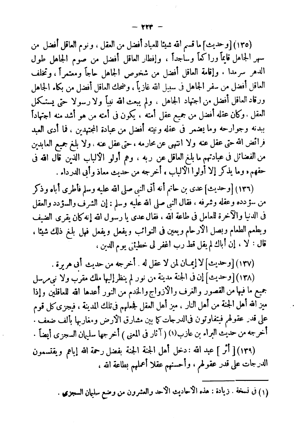 (138) [وَحَدِيثٌ] " إِنَّ فِي الْجَنَّةِ مَدِينَةً مِنْ نُورٍ لَمْ يَنْظُرْ إِلَيْهَا مَلَكٌ مُقَرَّبٌ وَلا نَبِيٌّ مُرْسَلٌ جَمِيعُ مَا فِيهَا مِنَ الْقُصُورِ وَالْغُرَفِ وَالأَزْوَاجِ وَالْخَدَمِ مِنَ النُّورِ أَعَدَّهَا اللَّهُ لِلْعَاقِلِينَ وَإِذَا مَيَّزَ اللَّهُ أَهْلَ الْجَنَّةِ مِنْ أَهْلِ النَّارِ، مَيَّزَ أَهْلَ الْعَقْلِ فَجَعَلَهُمْ فِي تِلْكَ الْمَدِينَةِ، فَيَجْزِي كُلَّ قَوْمٍ عَلَى قَدْرِ عُقُولِهِمْ فَيَتَفَاوَتُونَ فِي الدَّرَجَاتِ كَمَا بَيْنَ مَشَارِقِ الأَرْضِ وَمَغَارِبِهَا بِأَلْفِ ضِعْفٍ " أخرجه من حَدِيث الْبَراء بن عَازِب (آثَار فِي الْمَعْنى) أخرجهَا سبيمان السجْزِي أَيْضا. .