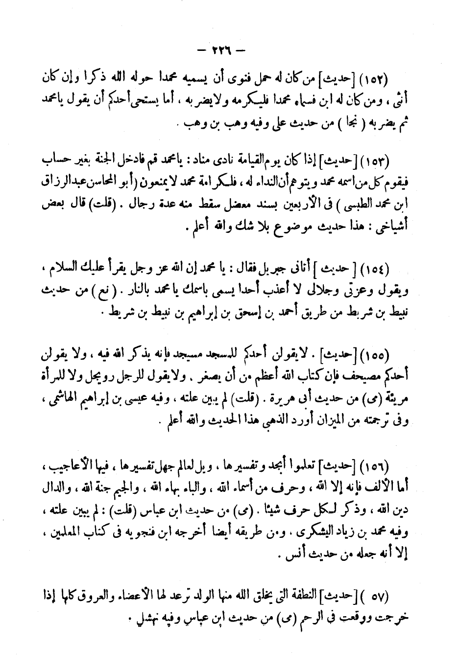 (153) [حَدِيثٌ] " إِذَا كَانَ يَوْمُ الْقِيَامَةِ نَادَى مُنَادٍ: يَا مُحَمَّدُ قُمْ فَادْخُلِ الْجَنَّةَ بِغَيْرِ حِسَابٍ فَيَقُومُ كُلُّ مَنِ اسْمُهُ مُحَمَّدٌ وَيَتَوَهَّمُ أَنَّ النِّدَاءَ لَهُ، فَلِكَرَامَةِ مُحَمَّدٍ لَا يُمْنَعُونَ " (أَبُو المحاسن عبد الرَّزَّاق ابْن مُحَمَّد الطبسي) فِي الْأَرْبَعين بِسَنَد معضل سقط مِنْهُ عدَّة رجال ". (قلت) قَالَ بعض أشياخي: هَذَا حَدِيث مَوْضُوع بِلَا شكّ وَالله أعلم.