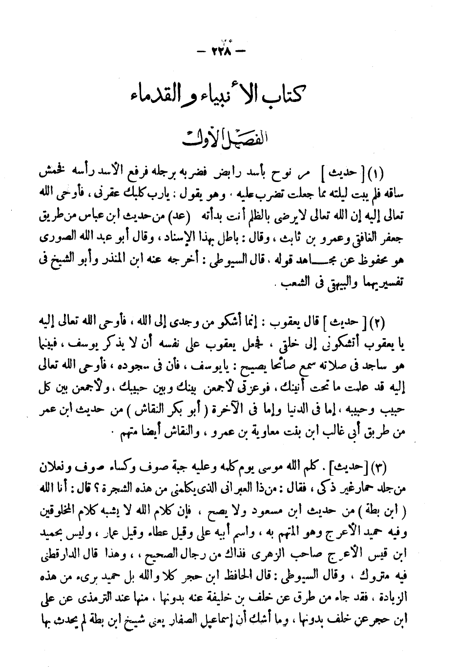 (1) [حَدِيثٌ] " مَرَّ نُوحٌ بِأَسَدٍ رَابِضٍ فَضَرَبَهُ بِرِجْلِهِ فَرَفَعَ الأَسَدُ رَأْسَهُ فَخَمَشَ سَاقَهُ فَلَمْ يَبِتْ لَيْلَتَهُ مِمَّا جَعَلَتْ تَضْرِبُ عَلَيْهِ. وَهُوَ يَقُولُ: يَا رَبِّ كَلْبُكَ عَقَرَنِي، فَأَوْحَى اللَّهُ تَعَالَى إِليه إِنَّ اللَّهَ تَعَالَى لَا يَرْضَى بِالظُّلْمِ أَنْتَ بَدَأْتَهُ " (عد) من حَدِيثِ ابْنِ عَبَّاسٍ مِنْ طَرِيقِ جَعْفَر الغافقي وَعَمْرو بن ثَابت، وَقَالَ بَاطِل بِهَذَا الْإِسْنَاد، وَقَالَ أَبُو عبد الله الصُّورِي هُوَ مَحْفُوظ عَن مُجَاهِد قَوْله، قَالَ السُّيُوطِيّ: أخرجه عَنهُ ابْن الْمُنْذر وَأَبُو الشَّيْخ فِي تفسيريهما وَالْبَيْهَقِيّ فِي الشّعب.