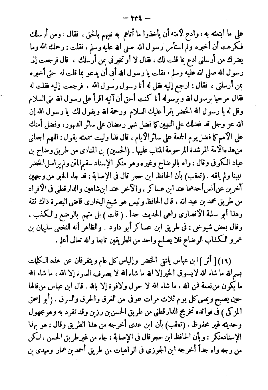 عَلَى مَا ابْتَعَثَهُ بِهِ، وَادْعُ لأُمَّتِهِ أَنْ يَأْخُذُوا مَا أَتَاهُمْ بِهِ نَبِيُّهُمْ بِالْحَقِّ، فَقَالَ: وَمَنْ أَرْسَلَكَ فَكَرِهْتُ أَنْ أُخْبِرَهُ وَلَمْ استأمر رَسُول الله، فَقُلْتُ: رَحِمَكَ اللَّهُ وَمَا يَضُرُّكَ مَنْ أَرْسَلَنِي ادْعُ بِمَا قُلْتُ لَكَ، فَقَالَ لَا أَوْ تُخْبِرَنِي بِمَنْ أَرْسَلَكَ، قَالَ فَرَجَعْتُ إِلَى رَسُول اللَّهِ، فَقُلْتُ يَا رَسُولَ اللَّهِ أَبَى أَنْ يَدْعُوَ بِمَا قُلْتُ لَهُ حَتَّى أُخْبِرَهُ بِمَنْ أَرْسَلَنِي، فَقَالَ: ارْجِعْ إِلَيْهِ فَقُلْ لَهُ أَنَا رَسُولُ رَسُولِ اللَّهِ، فَرَجَعْتُ إِلَيْهِ فَقُلْتُ لَهُ فَقَالَ مَرْحَبًا بِرَسُولِ اللَّهِ وَبِرَسُولِهِ أَنَا كُنْتُ أَحَقَّ أَنْ آتِيَهُ اقْرَأْ عَلَى رَسُولِ اللَّهِ مِنِّي السَّلامَ وَقُلْ لَهُ يَا رَسُولَ اللَّهِ الْخَضِرُ يَقْرَأُ عَلَيْكَ السَّلامَ وَرَحْمَةُ اللَّهِ وَيَقُولُ لَكَ يَا رَسُولَ اللَّهِ إِنَّ اللَّهَ عَزَّ وَجَلَّ قَدْ فَضَّلَكَ عَلَى النَّبِيِّينَ كَمَا فَضَّلَ شَهْرَ رَمَضَانَ عَلَى سَائِرِ الشُّهُورِ، وَفَضَّلَ أُمَّتَكَ عَلَى الأُمَمِ كَمَا فَضَّلَ يَوْمَ الْجُمُعَةِ عَلَى سَائِرِ الأَيَّامِ، قَالَ فَلَمَّا وليت سمعته يَقُول: الله اجْعَلنِي من هَذِه الْأمة المرشدة المرحومة المتاب عَلَيْهَا ". (الْحُسَيْن) بن الْمُنَادِي من طَرِيق وضاح بن عباد الْكُوفِي وَقَالَ: واه بالوضاح وَغَيره وَهُوَ مُنكر الْإِسْنَاد سقيم الْمَتْن وَلم يراسل الْخضر نَبينَا وَلم يلقه. (تعقب) بِأَن الْحَافِظ ابْن حجر قَالَ فِي الْإِصَابَة: قد جَاءَ الْخَبَر من وَجْهَيْن آخَرين عَن أنس أَحدهمَا عِنْد ابْن عَسَاكِر، وَالْآخر عِنْد ابْن شاهين وَالدَّارَقُطْنِيّ فِي الْأَفْرَاد من طَرِيق مُحَمَّد بن عبد الله، قَالَ الْحَافِظ وَلَيْسَ هُوَ شيخ البُخَارِيّ قَاضِي الْبَصْرَة ذَاك ثِقَة وَهَذَا أَبُو سَلمَة الْأنْصَارِيّ واهي الحَدِيث جدا. (قلت) بل مُتَّهم بِالْوَضْعِ وَالْكذب. وَقَالَ بعض شيوخي: فِي طَرِيق ابْن عَسَاكِر أَبُو دَاوُد. وَالظَّاهِر أَنه النَّخعِيّ سُلَيْمَان بن عَمْرو الْكذَّاب الوضاع فَلَا يصلح وَاحِد من الطَّرِيقَيْنِ تَابعا وَالله تَعَالَى أعلم.