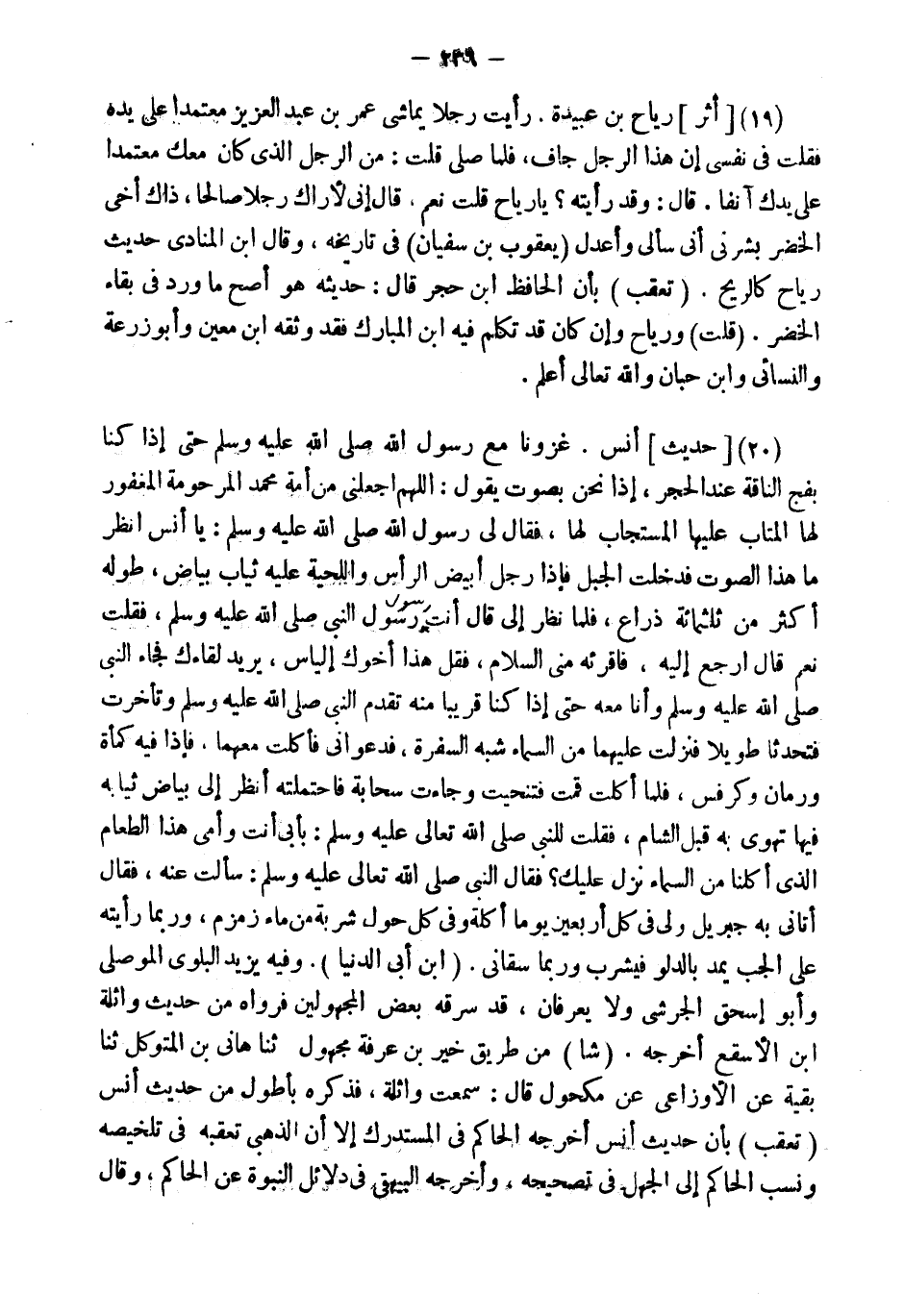 (20) [حَدِيثُ] أَنَسٍ. " غزونا مَعَ رَسُول الله حَتَّى إِذَا كُنَّا بِفَجِّ النَّاقَةِ عِنْدَ الْحَجَرِ، إِذَا نَحْنُ بِصَوْتٍ يَقُولُ: اللَّهُمَّ اجْعَلْنِي مِنْ أُمَّةِ مُحَمَّدٍ الْمَرْحُومَةِ الْمَغْفُورِ لَهَا الْمُتَابِ عَلَيْهَا الْمُسْتَجَابِ لَهَا، فَقَالَ لِي رَسُول الله: يَا أَنَسُ انْظُرْ مَا هَذَا الصَّوْتُ فَدَخَلْتُ الْجَبَلَ فَإِذَا رَجُلٌ أَبْيَضُ الرَّأْسِ وَاللِّحْيَةِ عَلَيْهِ ثِيَابٌ بَيَاض، طوله أَكثر من ثلثمِائة ذِرَاعٍ، فَلَمَّا نَظَرَ إِلَيَّ قَالَ أَنْت رَسُول النبى، فَقُلْتُ نَعَمْ قَالَ ارْجِعْ إِلَيْهِ، فَاقْرِئْهُ مِنِّي السَّلامَ، فَقُلْ هَذَا أَخُوكَ إِلْيَاسُ، يُرِيدُ لِقَاءَكَ فَجَاءَ النبى وَأَنَا مَعَهُ حَتَّى إِذَا كُنَّا قَرِيبا مِنْهُ تقدم النبى وَتَأَخَّرْتُ فَتَحَدَّثَا طَوِيلا فَنَزَلَتْ عَلَيْهِمَا مِنَ السَّمَاءِ شِبْهُ السُّفْرَةِ، فَدَعَوَانِي فَأَكَلْتُ مَعَهُمَا، فَإِذَا فِيهِ كَمْأَةٌ وَرُمَّانُ وَكَرَفْسُ، فَلَمَّا أَكَلْتُ قُمْتُ فَتَنَحَّيْتُ وَجَاءَتْ سَحَابَةٌ فَاحْتَمَلَتْهُ أَنْظُرُ إِلَى بَيَاضِ ثِيَابِهِ فِيهَا تَهْوِي بِهِ قِبَلَ الشَّامِ، فَقُلْتُ لِلنَّبِيِّ: بِأَبِي أَنْتَ وَأُمِّي هَذَا الطَّعَامُ الَّذِي أَكَلْنَا مِنَ السَّمَاءِ نَزَلَ عَلَيْك؟ فَقَالَ النبى: سَأَلْتَ عَنْهُ، فَقَالَ أَتَانِي بِهِ جِبْرِيلُ وَلِي فِي كُلِّ أَرْبَعِينَ يَوْمًا أَكْلَةٌ وَفِي كُلِّ حَوْلٍ شَرْبَةٌ مِنْ مَاءِ زَمْزَمَ، وَرُبَّمَا رَأَيْتُهُ عَلَى الْجُبِّ يَمُدُّ بِالَّدْلِو فَيَشْرَبُ وَرُبَّمَا سَقَانِي ". (ابْن أبي الدُّنْيَا) . وَفِيه يزِيد البلوي الْموصِلِي وَأَبُو إِسْحَق الجرشِي وَلَا يعرفان، قد سَرقه بعض المجهولين فَرَوَاهُ من حَدِيث وَاثِلَة ابْن الْأَسْقَع أخرجه. (شا) من طَرِيق خير بن عَرَفَة مَجْهُول ثَنَا هاني بن المتَوَكل ثَنَا بَقِيَّة عَن الْأَوْزَاعِيّ عَن مَكْحُول قَالَ: سَمِعت وَاثِلَة، فَذكره بأطول من حَدِيث أنس (تعقب) بِأَن حَدِيث أنس أخرجه الْحَاكِم فِي الْمُسْتَدْرك إِلَّا أَن الذَّهَبِيّ تعقبه فِي تلخيصه وَنسب الْحَاكِم إِلَى الْجَهْل فِي تَصْحِيحه، وَأخرجه الْبَيْهَقِيّ فِي دَلَائِل النُّبُوَّة عَن الْحَاكِم، وَقَالَ