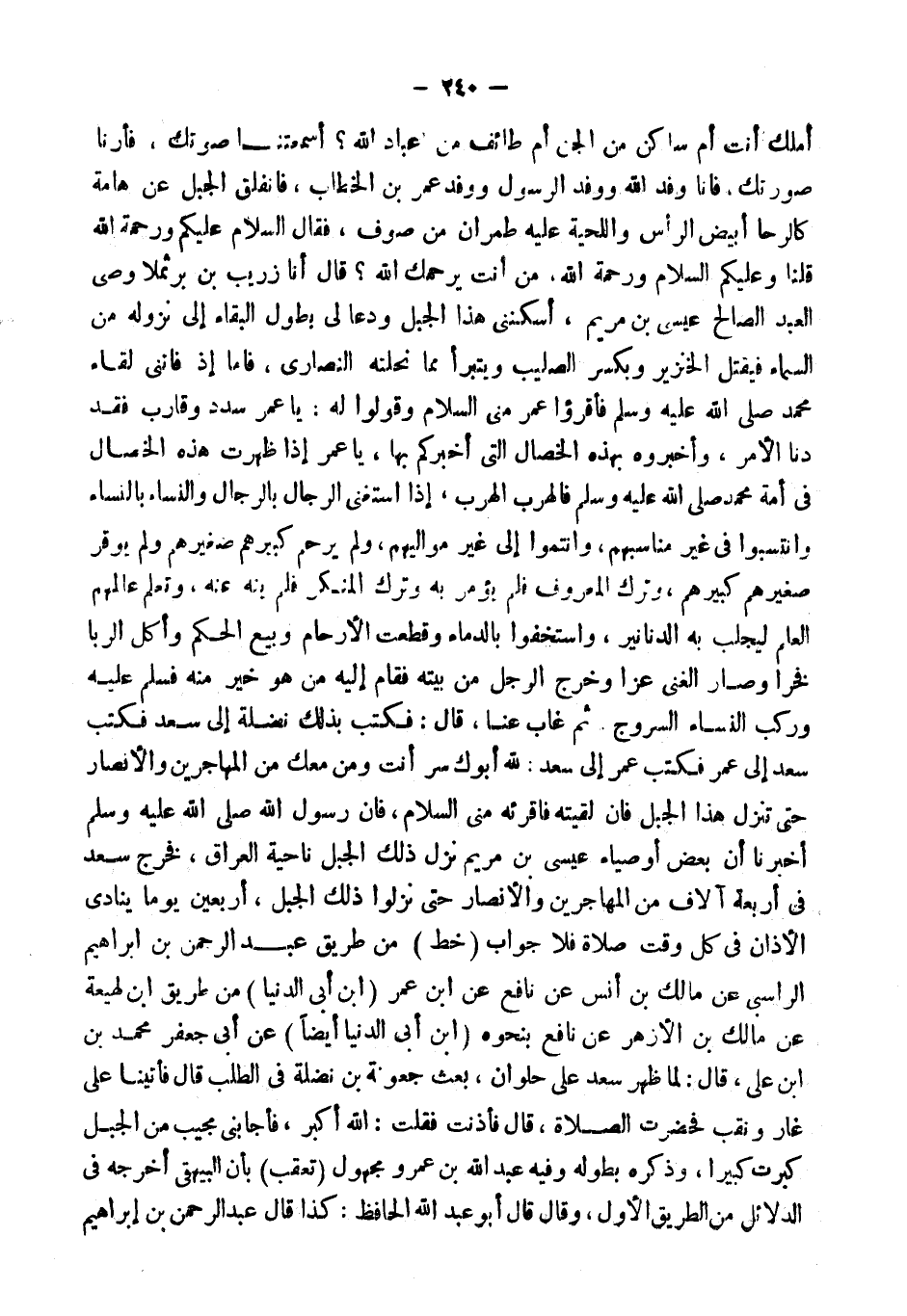 أَمَلَكٌ أَنْتَ أَمْ سَاكِنٌ مِنَ الْجِنِّ أَمْ طَائِفٌ مِنْ عِبَادِ اللَّهِ؟ أَسْمَعْتَنَا صَوْتَكَ، فَأَرِنَا صُورَتَكَ، فَإِنَّا وَفْدُ اللَّهِ وَوَفْدُ الرَّسُولِ لله وَوَفْدُ عُمَرَ بْنِ الْخَطَّابِ، فَانْفَلَقَ الْجَبَلُ عَنْ هَامَةٍ كَالرَّحَا أَبْيَضَ الرَّأْسِ وَاللِّحْيَةِ عَلَيْهِ طِمْرَانِ مِنْ صُوفٍ، فَقَالَ السَّلامُ عَلَيْكُمْ وَرَحْمَةُ اللَّهِ قُلْنَا وَعَلَيْكُمُ السَّلامُ وَرَحْمَةُ اللَّهِ، مَنْ أَنْتَ يَرْحَمُكَ اللَّهُ؟ قَالَ أَنَا زُرَيْبُ بْنُ بَرْثَمْلا وصّى العَبْد الصَّالح عِيسَى بن مَرْيَمَ، أَسْكَنَنِي هَذَا الْجَبَلَ وَدَعَا لِي بِطُولِ الْبَقَاءِ إِلَى نُزُولِهِ من السَّمَاء فَيقْتل الْخِنْزِير وبكسر الصَّلِيبَ وَيَتَبَرَّأُ مِمَّا نَحَلَتْهُ النَّصَارَى، فَأَمَا إِذْ فَاتَنِي لِقَاءُ مُحَمَّدٍ فأقرؤا عُمَرَ مِنِّي السَّلامَ وَقُولُوا لَهُ: يَا عُمَرُ سَدِّدْ وَقَارِبْ فَقَدْ دَنَا الأَمْرُ، وَأَخْبِرُوهُ بِهَذِهِ الْخِصَالِ الَّتِي أُخْبِرُكُمْ بِهَا، يَا عُمَرُ إِذَا ظَهَرَتْ هَذِهِ الْخِصَالُ فِي أمة مُحَمَّد فَالْهَرَبَ الْهَرَبَ، إِذَا اسْتَغْنَى الرِّجَالُ بِالرِّجَالِ وَالنِّسَاءُ بِالنِّسَاءِ وَانْتَسَبُوا فِي غَيْرِ مَنَاسِبِهِمْ، وَانْتَمَوْا إِلَى غَيْرِ مَوَالِيهِمْ، وَلَمْ يَرْحَمْ كَبِيرُهُمْ صَغِيرَهُمْ وَلَمْ يُوَقِّرْ صَغِيرُهُمْ كَبِيرَهُمْ، وَتُرِكَ الْمَعْرُوفُ فَلَمْ يُؤْمَرْ بِهِ وَتُرِكَ الْمُنْكَرُ فَلَمْ يُنْهَ عَنْهُ وَتَعَلَّمَ عَالِمُهُمُ الْعِلْمَ لِيَجْلِبَ بِهِ الدَّنَانِيرَ، وَاسْتَخَفُّوا بِالدِّمَاءِ وَقُطِّعَتِ الأَرْحَامُ وَبِيعَ الْحُكْمُ وَأُكِلَ الرِّبَا فَخْرًا وَصَارَ الْغِنَى عِزًّا وَخَرَجَ الرَّجُلُ مِنْ بَيْتِهِ فَقَامَ إِلَيْهِ مَنْ هُوَ خَيْرٌ مِنْهُ فَسَلَّمَ عَلَيْهِ وَرَكِبَ النِّسَاءُ السُّرُوجَ ثُمَّ غَابَ عَنَّا، قَالَ: فَكَتَب بِذَلِكَ نَضْلَةُ إِلَى سَعْدٍ فَكَتَب سَعْدٌ إِلَى عُمَر فَكَتَبَ عُمَرُ إِلَى سَعْدٍ: لِلَّهِ أَبُوكَ سِرْ أَنْتَ وَمَنْ مَعَكَ مِنَ الْمُهَاجِرِينَ وَالأَنْصَارِ حَتَّى تَنْزِلَ هَذَا الْجَبَلَ فَإِنْ لَقِيتَهُ فَاقْرِئْهِ مِنِّي السَّلامَ، فَإِنَّ رَسُولَ اللَّهِ أَخْبَرَنَا أَنَّ بَعْضَ أَوْصِيَاءِ عِيسَى بن مَرْيَمَ نَزَلَ ذَلِكَ الْجَبَلَ نَاحِيَةَ الْعِرَاقِ، فَخرج سعد فِي أَرْبَعَة آلَاف من الْمُهَاجِرين وَالْأَنْصَار حَتَّى نزلُوا ذَلِك الْجَبَل، أَرْبَعِينَ يَوْمًا يُنَادى الْأَذَان فِي كل وَقت صَلَاة فَلَا جَوَاب " (خطّ) من طَرِيق عبد الرَّحْمَن بن إِبْرَاهِيم الرَّاسِبِي عَن مَالك بن أنس عَن نَافِع عَن ابْن عمر (ابْن أبي الدُّنْيَا) من طَرِيق ابْن لَهِيعَة عَن مَالك بن الْأَزْهَر عَن نَافِع بِنَحْوِهِ (ابْن أبي الدُّنْيَا أَيْضا) عَن أبي جَعْفَر مُحَمَّد بن ابْن عَليّ، قَالَ: " لما ظهر سعد على حلوان، بعث جَعونَة بن نَضْلَة فِي الطّلب قَالَ فأتينا على غَار ونقب فَحَضَرت الصَّلَاة، قَالَ فَأَذنت فَقلت: الله أكبر، فَأَجَابَنِي مُجيب من الْجَبَل كَبرت كَبِيرا، وَذكره بِطُولِهِ وَفِيه عبد الله بن عَمْرو مَجْهُول " (تعقب) بِأَن الْبَيْهَقِيّ أخرجه فِي الدَّلَائِل من الطَّرِيق الأول، وَقَالَ قَالَ أَبُو عبد الله الْحَافِظ: كَذَا قَالَ عبد الرَّحْمَن بن إِبْرَاهِيم