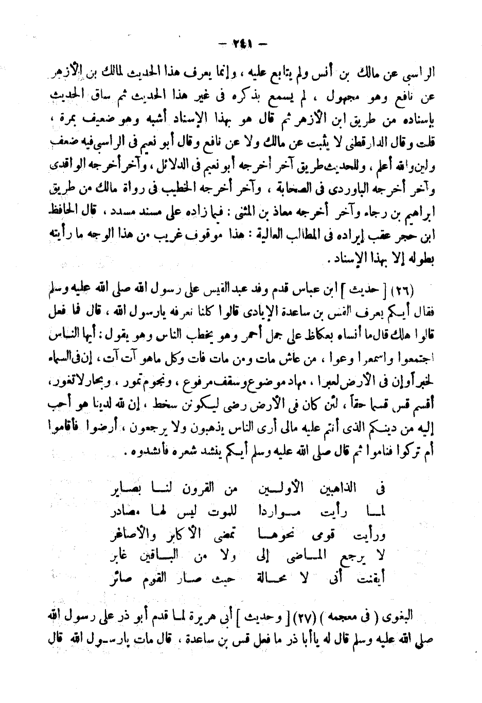 (26) [حَدِيثُ] " ابْنِ عَبَّاسٍ قَدِمَ وَفْدُ عَبْدِ الْقَيْسِ عَلَى رَسُولِ الله فَقَالَ أَيُّكُمْ يَعْرِفُ الْقُسَّ بْنَ سَاعِدَةَ الإِيَادِيَّ قَالُوا كُلُّنَا نَعْرِفُهُ يَا رَسُولَ اللَّهِ، قَالَ فَمَا فَعَلَ قَالُوا هَلَكَ قَالَ مَا أَنْسَاهُ بِعُكَاظَ عَلَى جَمَلٍ أَحْمَرَ وَهُوَ يَخْطُبُ النَّاسَ وَهُوَ يَقُولُ: أَيُّهَا النَّاسُ اجْتَمِعُوا وَاسْمَعُوا وَعُوا، مَنْ عَاشَ مَاتَ وَمَنْ مَاتَ فَاتَ وَكُلُّ مَا هُوَ آتٍ آتٍ، إِنَّ فِي السَّمَاءِ لَخَبَرًا وَإِنَّ فِي الأَرْضِ لَعِبَرًا، مِهَادٌ مَوْضُوعٌ وَسَقْفٌ مَرْفُوعٌ، وَنُجُومٌ تَمُورُ، وَبِحَارٌ لَا تَغُورُ، أَقْسَمَ قُسُّ قَسَمًا حَقًّا، لَئِنْ كَانَ فِي الأَرْضِ رِضًى لَيَكُونَنَّ سَخَطٌ، إِنَّ لِلَّهِ لَدِينًا هُوَ أَحَبُّ إِلَيْهِ مِنْ دِينِكُمُ الَّذِي أَنْتُمْ عَلَيْهِ مالى أَرَى النَّاسَ يَذْهَبُونَ وَلا يَرْجِعُونَ، أَرَضُوا فَأَقَامُوا أَمْ تُرِكُوا فَنَامُوا ثمَّ قَالَ أَيُّكُمْ يُنْشِدُ شِعْرَهُ فَأَنْشَدُوهُ.