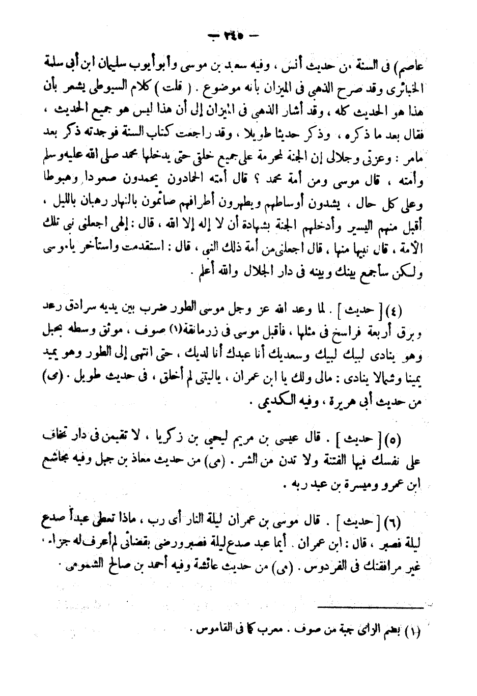عَاصِم) فِي السّنة من حَدِيث أنس، وَفِيه سعيد بن مُوسَى وَأَبُو أَيُّوب سُلَيْمَان بن أبي سَلمَة الخبائري وَقد صرح الذَّهَبِيّ فِي الْمِيزَان بِأَنَّهُ مَوْضُوع. (قلت) كَلَام السُّيُوطِيّ يشْعر بِأَن هَذَا هُوَ الحَدِيث كُله، وَقد أَشَارَ الذَّهَبِيّ فِي الْمِيزَان إِلَى أَن هَذَا لَيْسَ هُوَ جَمِيع الحَدِيث، فَقَالَ بعد مَا ذكره، وَذكر حَدِيثا طَويلا، وَقد راجعت كتاب السّنة فَوَجَدته ذكر بعد مَا مر: " وَعِزَّتِي وَجَلَالِي إِن الْجنَّة لمحرمة على جَمِيع خلقي حَتَّى يدخلهَا مُحَمَّد وَأمته، قَالَ مُوسَى وَمن أمة مُحَمَّد؟ قَالَ أمته الْحَمَّادُونَ يحْمَدُونَ صعُودًا وهبوطا وعَلى كل حَال، يشدون أوساطهم ويطهرون أَطْرَافهم صائمون بِالنَّهَارِ رُهْبَان بِاللَّيْلِ، أقبل مِنْهُم الْيَسِير وأدخلهم الْجنَّة بِشَهَادَة أَن لَا إِلَهَ إِلا اللَّهُ، قَالَ: إلهي اجْعَلنِي نَبِي تِلْكَ الْأمة، قَالَ نبيها مِنْهَا، قَالَ اجْعَلنِي من أمة ذَلِك النَّبِي، قَالَ: استقدمت واستأخر يَا مُوسَى وَلَكِن سأجمع بَيْنك وَبَينه فِي دَار الْجلَال " وَالله أعلم.