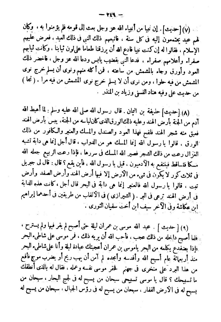 (8) [حَدِيثُ] " حُذَيْفَةَ بْنِ الْيَمَانِ. قَالَ رَسُولُ اللَّهِ: لَمَّا أَهْبَطَ اللَّهُ آدَمَ مِنَ الْجَنَّةِ بِأَرْضِ الْهِنْدِ وَعَلَيْهِ ذَلِكَ الْوَرَقُ الَّذِي كَانَ لِبَاسَهُ مِنَ الْجَنَّةِ، يَبُسَ بِأَرْضِ الْهِنْدِ فَعَبِقَ مِنْهُ شجر الْهِنْد فلفح فَهَذَا الْعُودُ وَالصَّنْدَلُ وَالْمِسْكُ وَالْعَنْبَرُ وَالْكَافُورُ مِنْ ذَلِكَ الْوَرَقِ، قَالُوا يَا رَسُولَ اللَّهِ إِنَّما الْمِسْكُ هُوَ مِنَ الدَّوَابِّ، قَالَ أَجَلْ إِنَّمَا هِيَ دَابَّةٌ تُشْبِهُ الْغَزَالَ رَعَتْ مِنْ ذَلِكَ الشَّجَرِ فَصَيَّرَ اللَّهُ الْمِسْكَ فِي سُرَرِهَا، فَإِذَا رَعَتِ الرَّبِيعَ جَعَلَهُ اللَّهُ مِسْكًا فَتَسَاقَطَ فَيَنْتَفِعُ بِهِ الآدَمِيُّونَ، قِيلَ يَا رَسُولَ اللَّهِ، فَأَيْنَ يَقَعُ؟ قَالَ: قَالَ لِي جِبْرِيلُ فِي ثَلاثِ كُوَرٍ لَا يَكُونُ فِي شئ مِنَ الأَرْضِ إِلا فِيهَا أَرْضِ الْهِنْدِ وَأَرْضِ الصَّفَدِ وَأَرْضِ تِبِتَ، قَالُوا يَا رَسُولَ اللَّهِ فَالْعَنْبَرُ إِنَّمَا هِيَ دَابَّةٌ فِي الْبَحْرِ قَالَ أَجَلْ، كَانَتْ هَذِهِ الدَّابَّةُ فِي أَرْضِ الْهِنْدِ تَرْعَى فِي الْبَرِّ ". (الشِّيرَازِيّ) فِي الألقاب من طَرِيقين فى أَحدهمَا إِبْرَاهِيم ابْن عكاشة وَفِي الآخر سيف ابْن أُخْت سُفْيَان الثَّوْريّ.