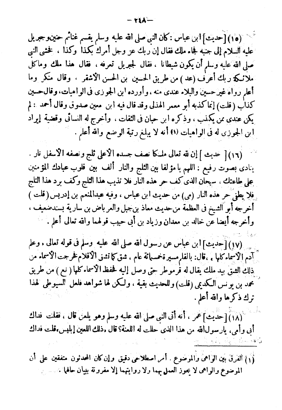 (15) [حَدِيثُ] ابْنِ عَبَّاسٍ: " كَانَ النَّبِيُّ يُقَسِّمُ غَنَائِمَ حُنَيْنٍ وَجِبْرِيلُ عَلَيْهِ السَّلامُ إِلَى جَنْبِهِ فَجَاءَ مَلَكٌ فَقَالَ إِنَّ رَبَّكَ عَزَّ وَجَلَّ أَمَرَكَ بِكَذَا وَكَذَا، فَخَشِيَ النَّبِيُّ أَنْ يَكُونَ شَيْطَانًا، فَقَالَ لِجِبْرِيلَ تَعْرِفُهُ، فَقَالَ هَذَا مَلَكٌ وَمَا كُلُّ مَلائِكَةِ رَبِّكَ أَعْرِفُ " (عد) من طَرِيق الْحُسَيْن بن الْحسن الْأَشْقَر، وَقَالَ مُنكر وَمَا أعلم رَوَاهُ غير حُسَيْن وَالْبَلَاء عِنْدِي مِنْهُ، وَأوردهُ ابْن الْجَوْزِيّ فِي الواهيات، وَقَالَ حُسَيْن كَذَّاب (قلت) إِنَّمَا كذبه أَبُو معمر الْهُذلِيّ وَقد قَالَ فِيهِ ابْن معِين صَدُوق وَقَالَ أَحْمد: لم يكن عِنْدِي مِمَّن يكذب، وَذكره ابْن حبَان فِي الثِّقَات، وَأخرج لَهُ النَّسَائِيّ وَقَضِيَّة إِيرَاد ابْن الْجَوْزِيّ لَهُ فِي الواهيات أَنه لَا يبلغ رُتْبَة الْوَضع وَالله أعلم.