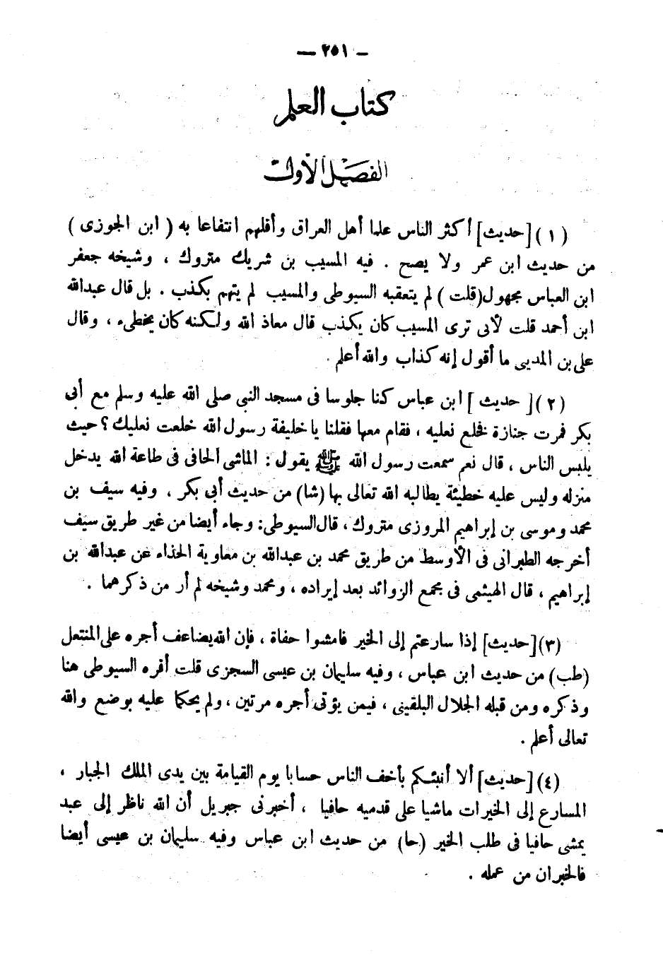 (1) [حَدِيثٌ] " أَكْثَرُ النَّاسِ عِلْمًا أَهْلُ الْعِرَاقِ وَأَقَلُّهُمُ انْتِفَاعًا بِهِ " (ابْن الْجَوْزِيّ) من حَدِيث ابْن عمر وَلَا يَصح. فِيهِ الْمسيب بن شريك مَتْرُوك، وَشَيْخه جَعْفَر ابْن الْعَبَّاس مَجْهُول (قلت) لم يتعقبه السُّيُوطِيّ وَالْمُسَيب لم يتهم بكذب. بل قَالَ عبد الله ابْن أَحْمد قلت لأبي ترى الْمسيب كَانَ يكذب قَالَ معَاذ الله وَلكنه كَانَ يُخطئ، وَقَالَ عَليّ بن الْمَدِينِيّ مَا أَقُول إِنَّه كَذَّاب وَالله أعلم.