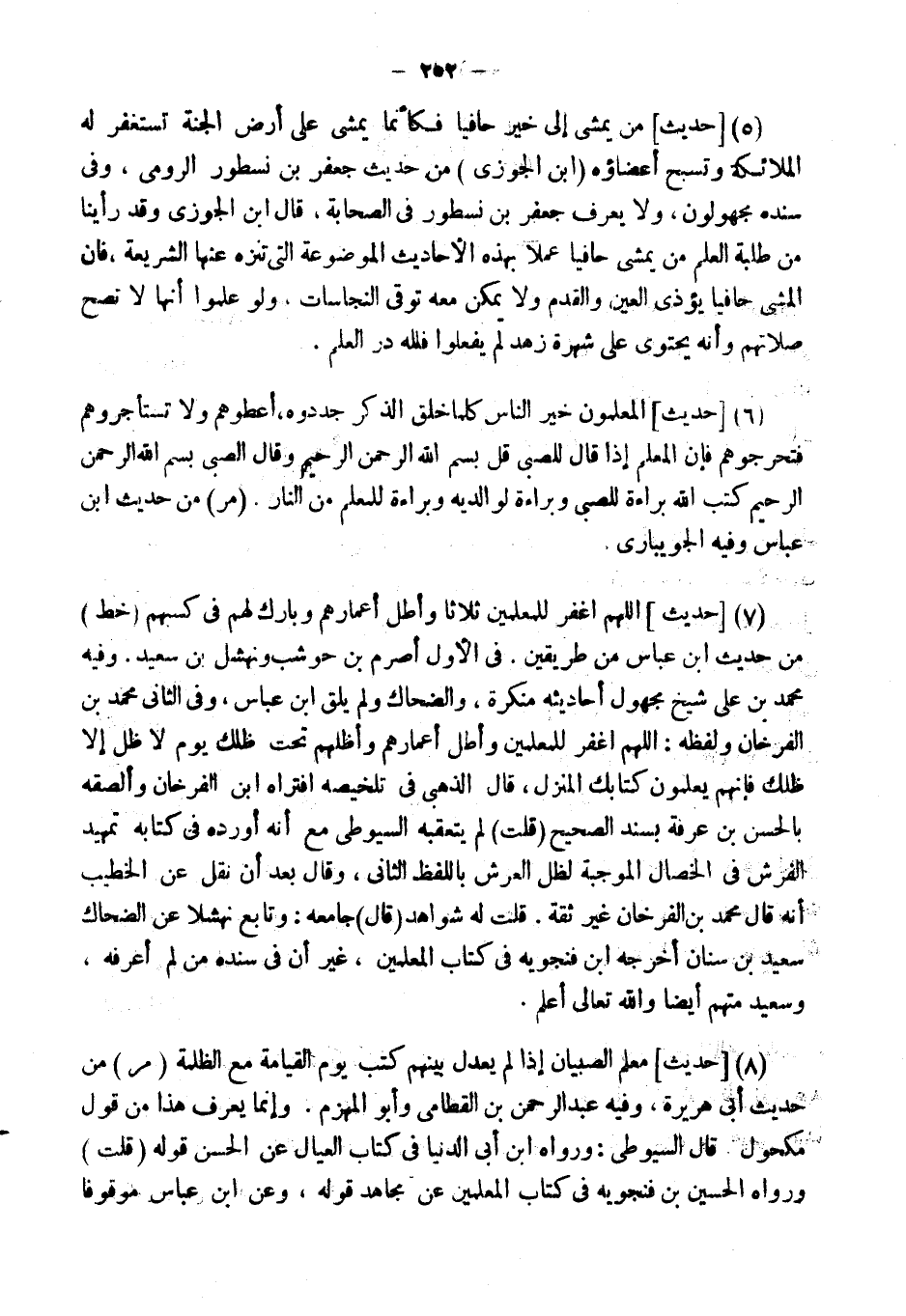 (5) [حَدِيثٌ] " مَنْ يَمْشِي إِلَى خَيْرٍ حَافِيًا فَكَأَنَّمَا يَمْشِي عَلَى أَرْضِ الْجَنَّةِ تَسْتَغْفِرُ لَهُ الْمَلائِكَةُ وَتُسَبِّحُ أَعْضَاؤُهُ " (ابْن الْجَوْزِيّ) من حَدِيث جَعْفَر بن نسطور الرُّومِي، وَفِي سَنَده مَجْهُولُونَ، وَلَا يعرف جَعْفَر بن نسطور فِي الصَّحَابَة، قَالَ ابْن الْجَوْزِيّ وَقد رَأينَا من طلبة الْعلم من يمشي حافيا عملا بِهَذِهِ الْأَحَادِيث الْمَوْضُوعَة الَّتِي تنزه عَنْهَا الشَّرِيعَة، فَإِن الْمَشْي حافيا يُؤْذِي الْعين والقدم وَلَا يُمكن مَعَه توقي النَّجَاسَات، وَلَو علمُوا أَنَّهَا لَا تصح صلَاتهم وَأَنه يحتوي على شهرة زهد لم يَفْعَلُوا فَللَّه در الْعلم.