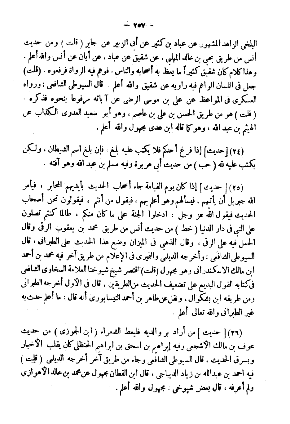 (25) [حَدِيثٌ] " إِذَا كَانَ يَوْمُ الْقِيَامَةِ جَاءَ أَصْحَابُ الْحَدِيثِ بِأَيْدِيهِمُ الْمَحَابِرُ، فَيَأْمُرُ اللَّهُ جِبْرِيلَ أَنْ يَأْتِيَهُمْ، فَيَسْأَلَهُمْ وَهُوَ أَعْلَمُ بِهِمْ، فَيَقُولُ مَنْ أَنْتُمْ، فَيَقُولُونَ نَحْنُ أَصْحَابُ الْحَدِيثِ فَيَقُولُ اللَّهُ عَزَّ وَجَلَّ: ادْخُلُوا الْجَنَّةَ عَلَى مَا كَانَ مِنْكُمْ، طَالَمَا كُنْتُمْ تُصَلُّونَ عَلَى النَّبِيِّ فِي دَارِ الدُّنْيَا " (خطّ) من حَدِيثِ أَنَسٍ مِنْ طَرِيقِ مُحَمَّدِ بن يَعْقُوب الرقي وَقَالَ الْحمل فِيهِ على الرقي، وَقَالَ الذَّهَبِيّ فِي الْمِيزَان وضع هَذَا الحَدِيث على الطَّبَرَانِيّ، قَالَ السُّيُوطِيّ الشَّافِعِي: وَأخرجه الديلمي والنميري فِي الْإِعْلَام من طَرِيق آخر فِيهِ مُحَمَّد بن أَحْمد ابْن مَالك الإسْكَنْدراني وَهُوَ مَجْهُول (قلت) اقْتصر شيخ شُيُوخنَا الْعَلامَة السخاوي الشَّافِعِي فِي كِتَابه القَوْل البديع على تَضْعِيف الحَدِيث من الطَّرِيقَيْنِ، قَالَ فِي الأول أخرجه الطَّبَرَانِيّ وَمن طَرِيقه ابْن بشكوال، وَنقل عَن طَاهِر بن أَحْمد النَّيْسَابُورِي أَنه قَالَ: مَا أعلم حدث بِهِ غير الطَّبَرَانِيّ وَالله تَعَالَى أعلم.