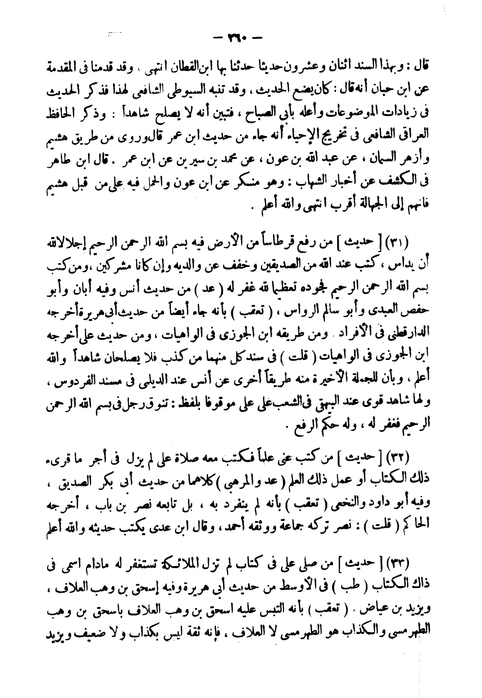 (31) [حَدِيثٌ] " مَنْ رَفَعَ قِرْطَاسًا مِنَ الأَرْضِ فِيهِ بِسم الله الرَّحْمَن الرَّحِيم إِجْلالا لِلَّهِ أَنْ يُدَاسَ، كُتِبَ عِنْدَ اللَّهِ مِنَ الصِّدِّيقِينَ وَخُفِّفَ عَنْ وَالِدَيْهِ وَإِنْ كَانَا مُشْرِكَيْنِ، وَمَنْ كَتَبَ بِسْمِ اللَّهِ الرَّحْمَنِ الرَّحِيمِ فَجَوَّدَهُ تَعْظِيمًا لِلَّهِ غَفَرَ لَهُ " (عد) من حَدِيث أنس وَفِيه أبان وَأَبُو حَفْص الْعَبْدي وَأَبُو سَالم الرواس، (تعقب) بِأَنَّهُ جَاءَ أَيْضا من حَدِيث أبي هُرَيْرَة أخرجه الدَّارَقُطْنِيّ فِي الْأَفْرَاد، وَمن طَرِيقه ابْن الْجَوْزِيّ فِي الواهيات، وَمن حَدِيث عَليّ أخرجه ابْن الْجَوْزِيّ فِي الواهيات (قلت) فِي سَنَد كل مِنْهُمَا من كذب فَلَا يصلحان شَاهدا وَالله أعلم، وَبِأَن للجملة الْأَخِيرَة مِنْهُ طَرِيقا أُخْرَى عَن أنس عِنْد الديلمي فِي مُسْند الفردوس، وَلها شَاهد قوي عِنْد الْبَيْهَقِيّ فِي الشّعب على عَليّ مَوْقُوفا بِلَفْظ: " تنوق رجل فِي بِسم الله الرَّحْمَن الرَّحِيم فغفر لَهُ، وَله حكم الرّفْع ".