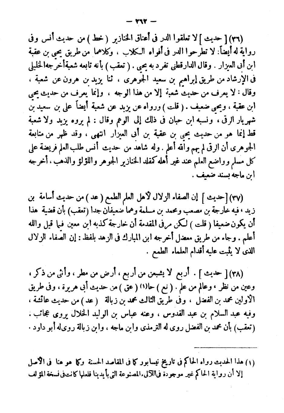 (38) [حَدِيثٌ] . " أَرْبَعٌ لَا يَشْبَعْنَ مِنْ أَرْبَعٍ، أَرْضٌ مِنْ مَطَرٍ، وَأُنْثَى مِنْ ذَكَرٍ، وَعَيْنٌ مِنْ نَظَرٍ، وَعَالِمٌ مِنْ عِلْمٍ ". (نع) حا (عق) من حَدِيث أبي هُرَيْرَة، وَفِي طَرِيق الْأَوَّلين مُحَمَّد بن الْفضل، وَفِي طَرِيق الثَّالِث مُحَمَّد بن زبالة (عد) من حَدِيث عَائِشَة، وَفِيه عبد السَّلَام بن عبد القدوس، وَعنهُ عَبَّاس بن الْوَلِيد الْخلال يروي عجائب. (تعقب) بِأَن مُحَمَّد بن الْفضل روى لَهُ التِّرْمِذِيّ وَابْن مَاجَه، وَابْن زبالة روى لَهُ أَبُو دَاوُد.