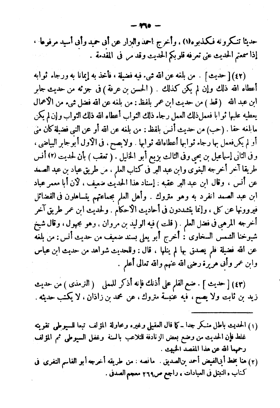(42) [حَدِيثٌ] . " مَنْ بلغه عَن الله شئ فِيهِ فَضِيلَةٌ، فَأَخَذَ بِهِ إِيمَانًا بِهِ وَرَجَاءَ ثَوَابِهِ أَعْطَاهُ اللَّهُ ذَلِكَ وَإِنْ لَمْ يَكُنْ كَذَلِكَ ". (الْحسن بن عَرَفَة) فِي جزئه من حَدِيث جَابر ابْن عبد الله (قطّ) من حَدِيث ابْن عمر بِلَفْظ: " من بلغه عَن الله فضل شئ من الْأَعْمَال يُعْطِيهِ عَلَيْهَا ثَوابًا فَعمل ذَلِك الْعَمَل رَجَاء ذَلِك الثَّوَاب أعطَاهُ الله ذَلِك الثَّوَاب وَإِن لم يكن مَا بلغه حَقًا ". (حب) من حَدِيث أنس بِلَفْظ: " من بلغه عَن الله أَو عَن النَّبِي فَضِيلَة كَانَ مني أَو لم يكن فَعمل بهَا رَجَاء ثَوَابهَا أعطَاهُ الله ثَوَابهَا ". وَلَا يَصح، فِي الأول أَبُو جَابر البياضي، وَفِي الثَّانِي إِسْمَاعِيل بن يحيى وَفِي الثَّالِث بزيع أَبُو الْخَلِيل. (تعقب) بِأَن حَدِيث أنس طَرِيقا آخر أخرجه الْبَغَوِيّ وَابْن عبد الْبر فِي كتاب الْعلم، من طَرِيق عباد بن عبد الصَّمد عَن أنس، وَقَالَ ابْن عبد الْبر عقبه: إِسْنَاد هَذَا الحَدِيث ضَعِيف، لِأَن أَبَا معمر عباد ابْن عبد الصَّمد انْفَرد بِهِ وَهُوَ مَتْرُوك. وَأهل الْعلم بجماعتهم يتساهلون فِي الْفَضَائِل فيروونها عَن كل، وَإِنَّمَا يتشددون فِي أَحَادِيث الْأَحْكَام. وَلِحَدِيث ابْن عمر طَرِيق آخر أخرجه المرهبي فِي فضل الْعلم. (قلت) فِيهِ الْوَلِيد بن مَرْوَان، وَهُوَ مَجْهُول، وَقَالَ شيخ شُيُوخنَا الشَّمْس السخاوي: أخرج أَبُو يعلى بِسَنَد ضَعِيف من حَدِيث أنس: " من بلغه عَن الله فَضِيلَة فَلم يصدق بهَا لم ينلها، " قَالَ: وَلِلْحَدِيثِ شَوَاهِد من حَدِيث ابْن عَبَّاس وَابْن عمر وَأبي هُرَيْرَة رَضِي الله عَنْهُم وَالله تَعَالَى أعلم.